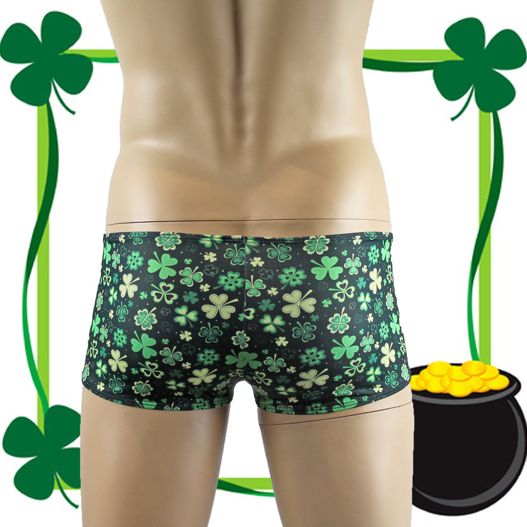 Mens stretch spandex lycra St Patricks Day, the Luck of the Irish Mini low cut Boxer Briefs with slightly contoured pouch front and elastic waist and legs