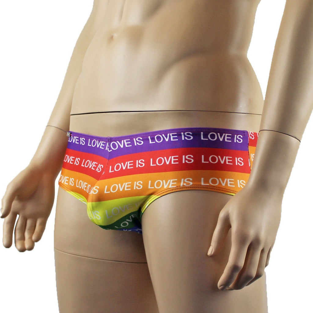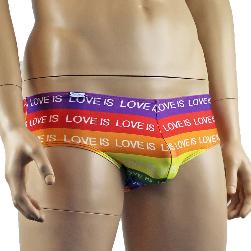 Mens stretch spandex lycra gay pride rainbow with Love is Love print low rise mini Boxer Briefs with contoured pouch front, has elastic around the waist and legs for strong support, it can be worn in the swimming pool too!