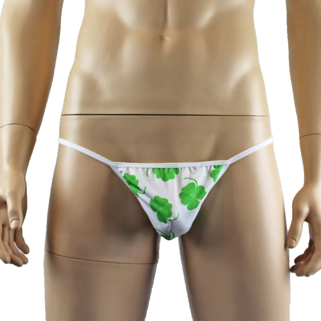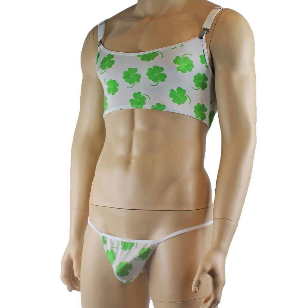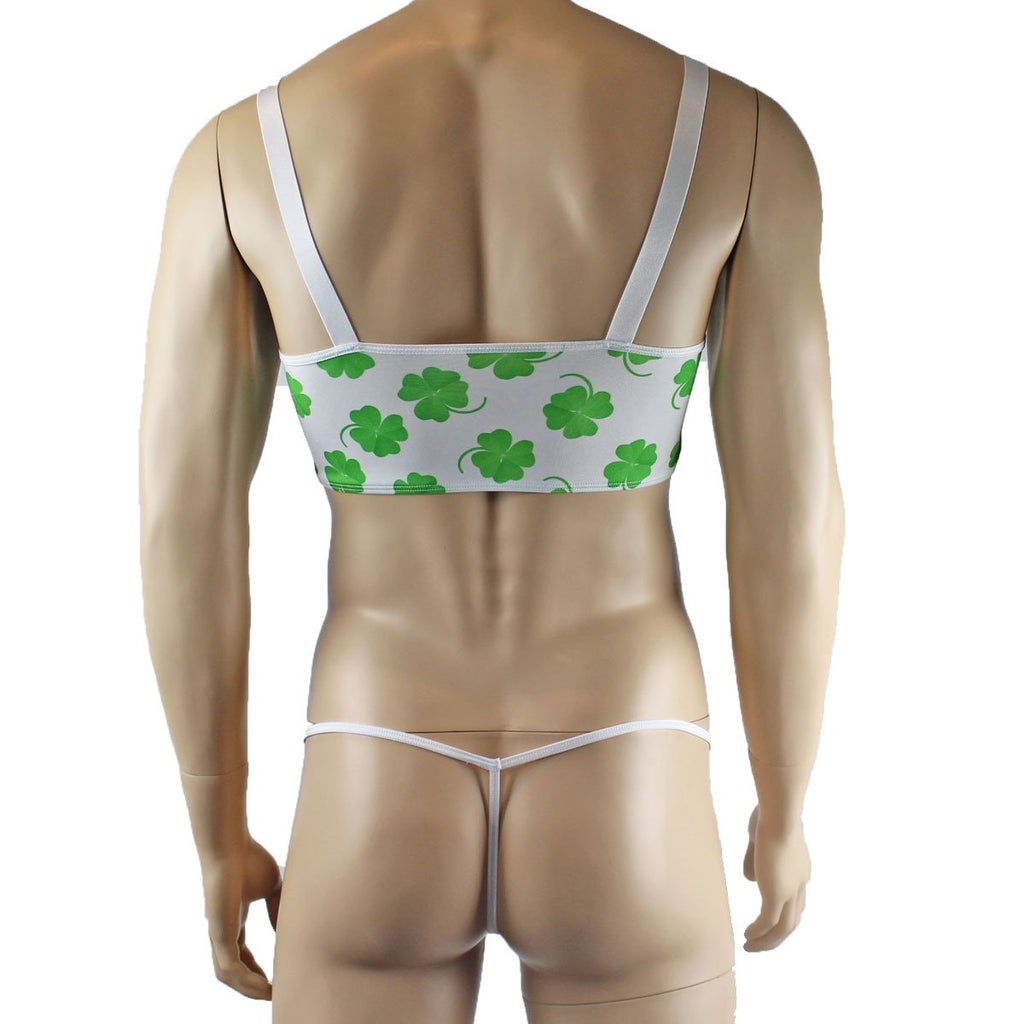 Mens stretch spandex lycra Lucky 4 leaf clover St Patricks Day mini Crop Top with elastic hem and wide elastic shoulder straps with metal adjustable clip, comes with matching Pouch G string with thin elastic back and waistband