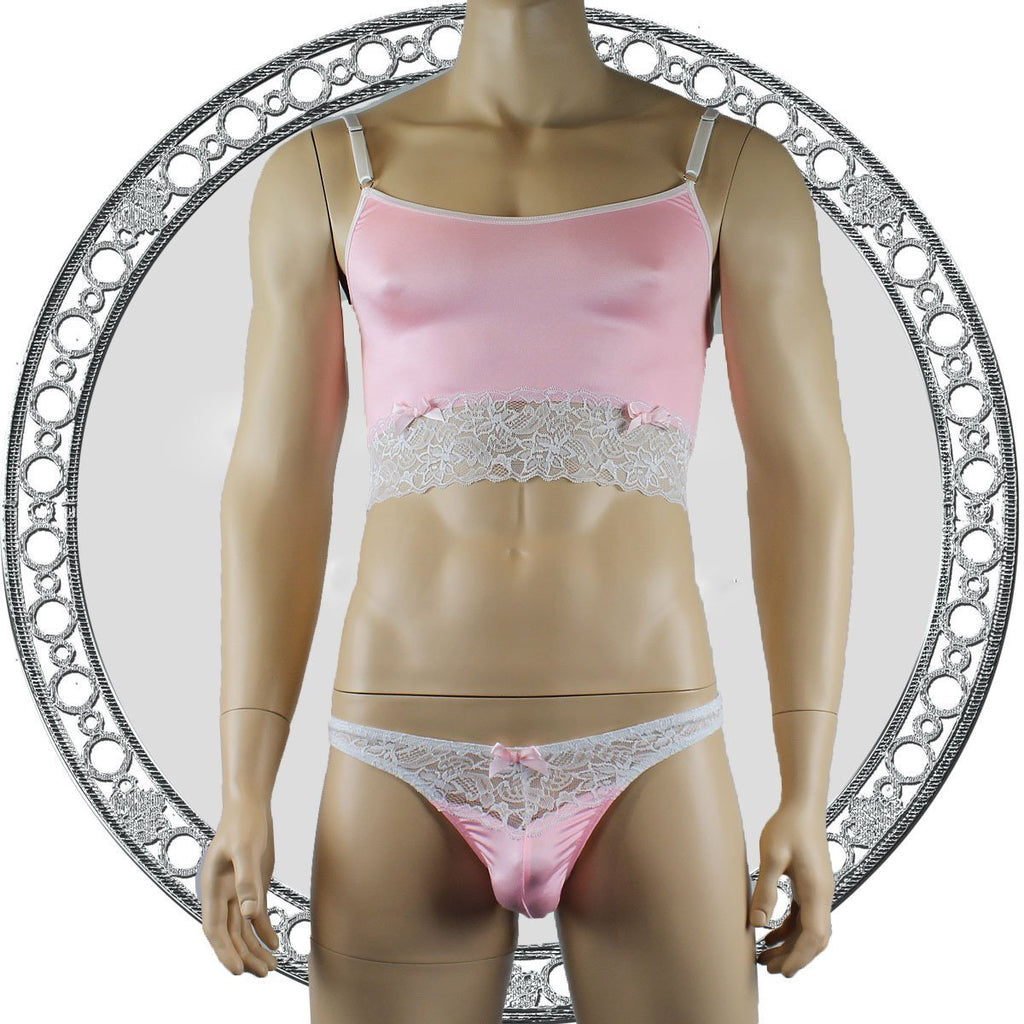 Mens Joanne Satin & Lace Crop Cami Top with Sexy Thong - Sizes up to 3XL Light Pink and White Lace