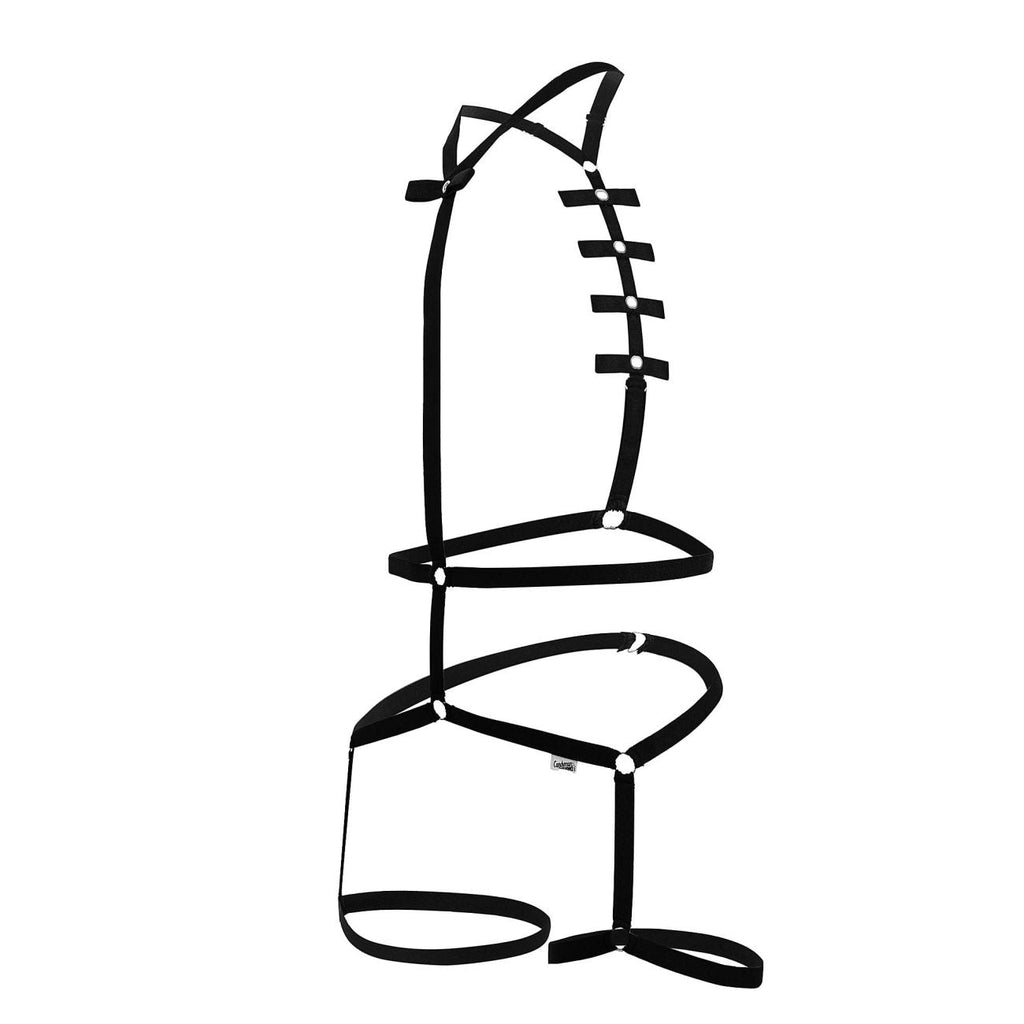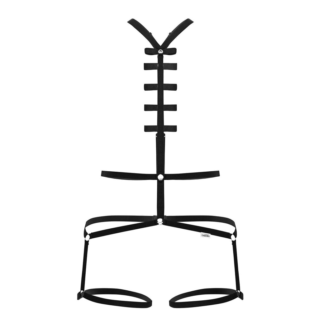 This bold harness set by CandyMan blends minimalist straps with a daring, body-revealing design. The harness features thin black straps that run down the torso and around the waist and thighs, connected by metal rings for an edgy, fetish-inspired look. The back includes a spine-like vertical strap design that adds a striking visual element. This piece is perfect for those looking to add a provocative, adventurous statement to their intimate wardrobe.