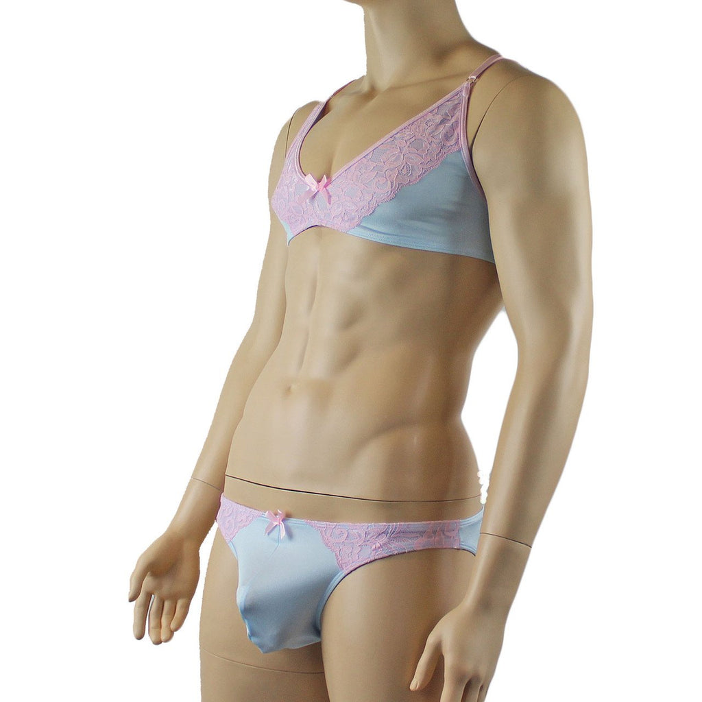 Mens Isabel Bra Top and Bikini Brief Male Lingerie Light Blue and Pink Lace