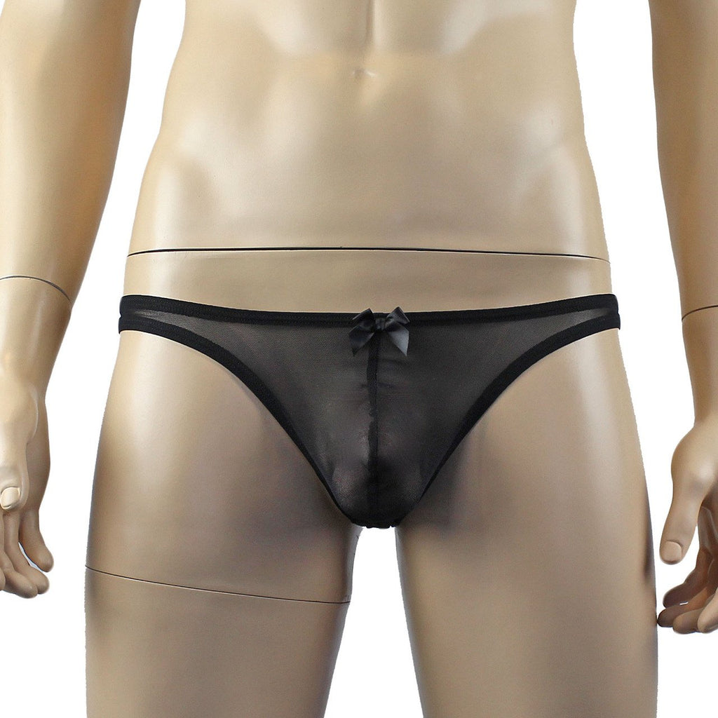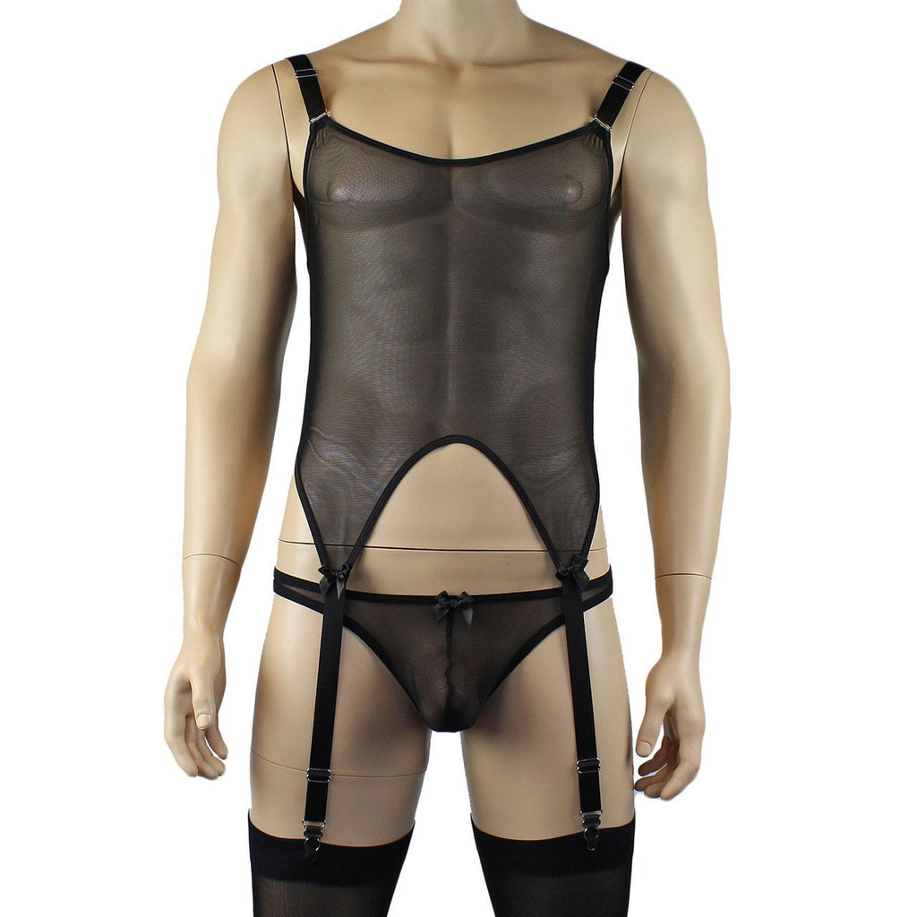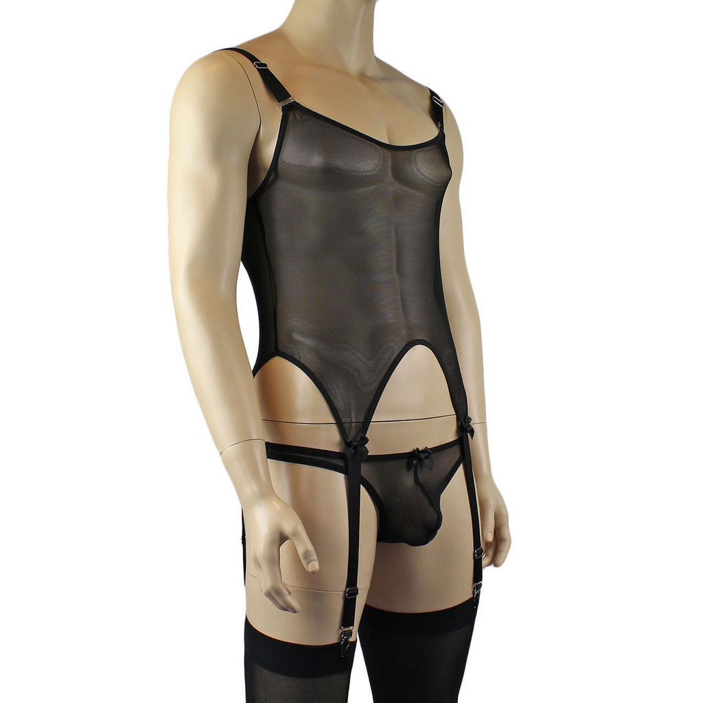 Mens sexy stretch sheer mesh Corset Top with adjustable wide elastic shoulder straps and garters with extra strong metal adjustment clips and garters. Has sexy satin ribbon bows on each garter for that feminine touch. Comes with matching G string Thong with pouch front, elastic sides and waist and bow front. Comes with plain opaque Stockings.