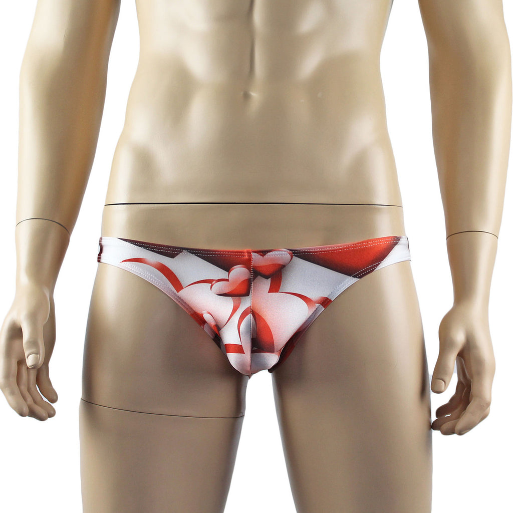 Mens stretch spandex big bold and beautiful heart print lycra Bikini Brief with sexy butt look, has elasticized sides and waist