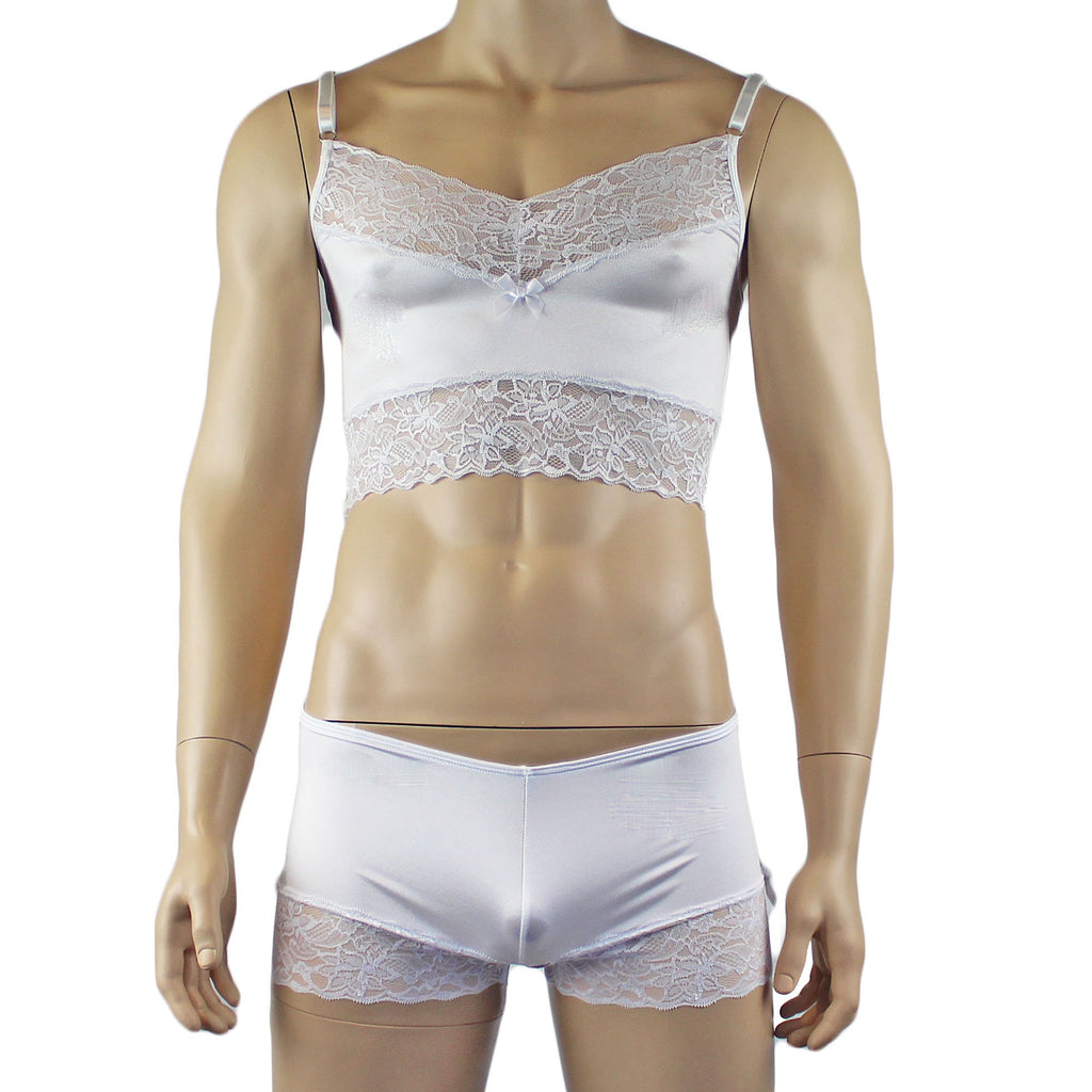 Mens romance stretch satin spandex Camisole Top with floral lace front, has adjustable shoulder straps and satin bow detail. Easily step into it or pull over your head, Sexy and feminine. Comes with low waist Boxer Shorts with floral lace around the legs, wide sides for comfort and has a satin bow sides.