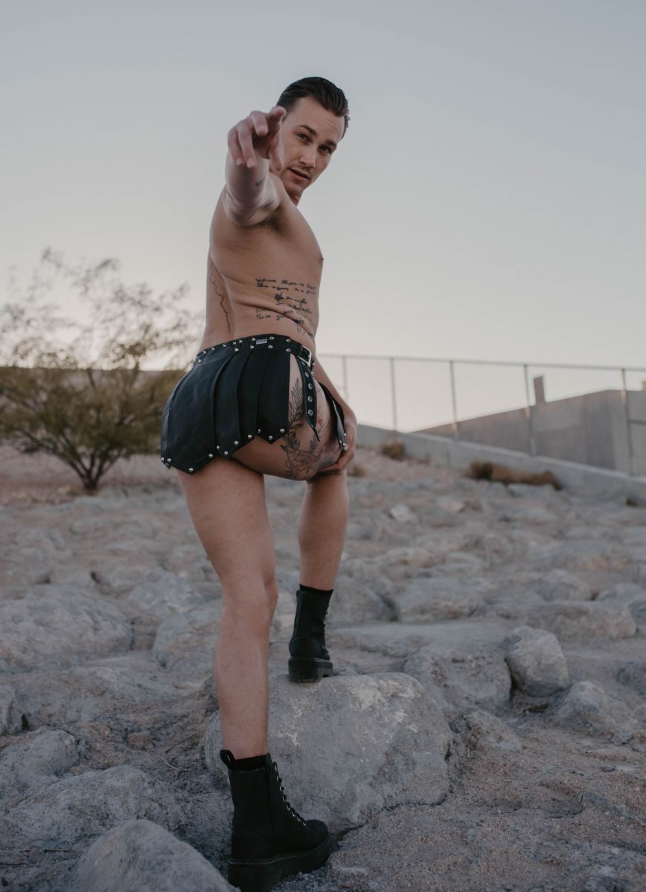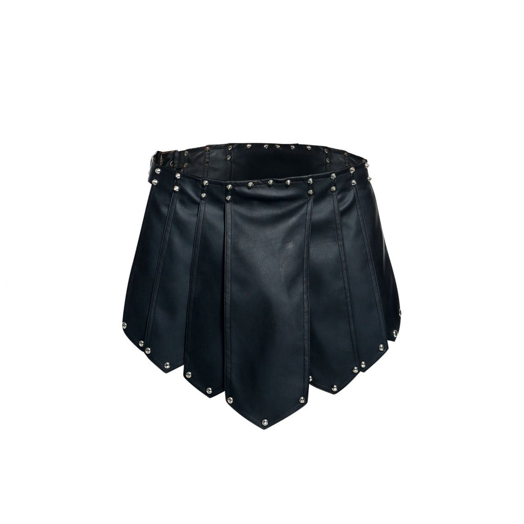 Sexy Roman skirt, elaborated in a soft microfiber fabric that looks like leather. Adorned with metallic details. Open on the sides. Triangular design on the back and front.