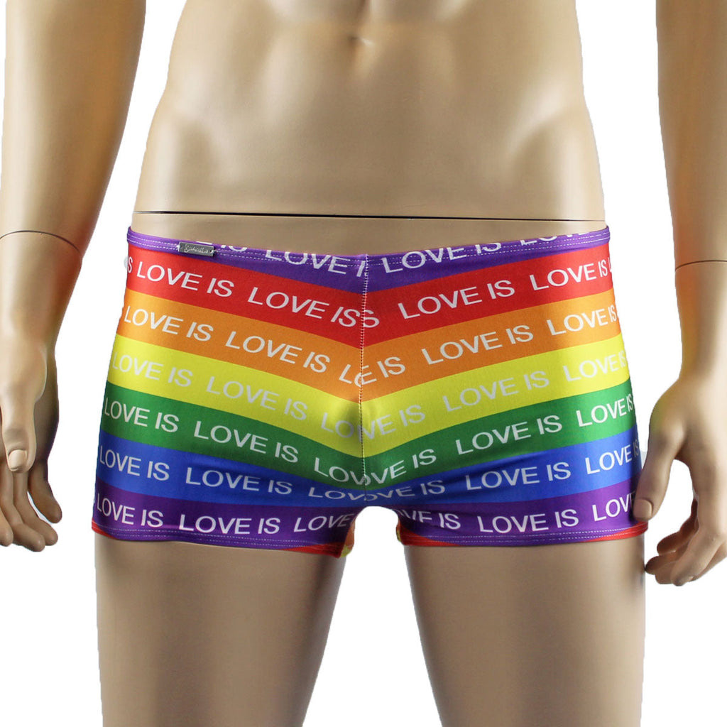 Mens stretch spandex lycra gay pride flag design Shorts with "Love Is Love" print, has slightly contoured pouch front and elasticized waist and legs