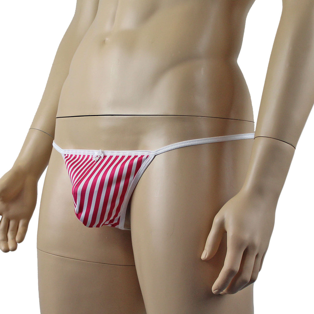 Mens stretch spandex Candy Stripes G string Pouch with thin elastic back and waistband, has a satin ribbon bow with silver heart on the front. Wrap your present up in this and have fun when it is opened