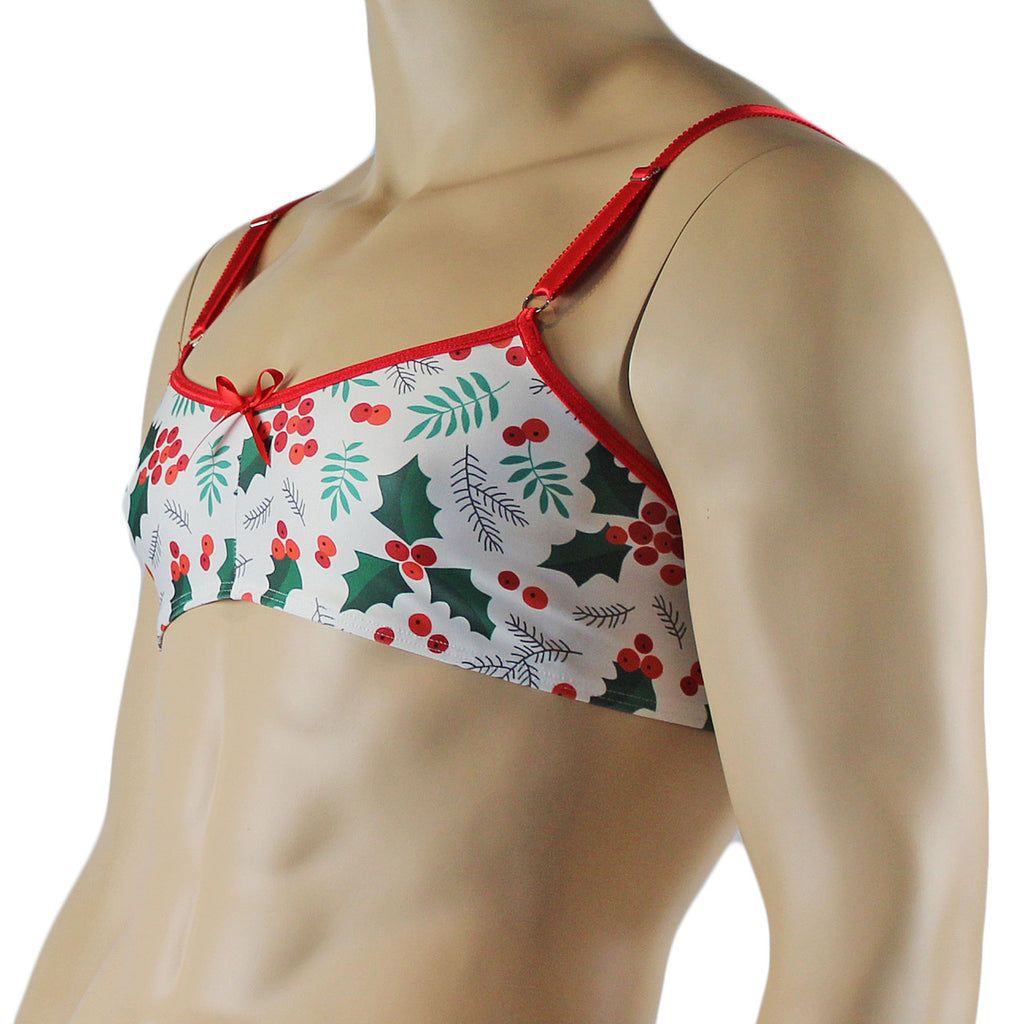 Dress up for Xmas in our mens stretch spandex Christmas Holly Bra Top, has stretch elastic trim and adjustable shoulder straps. Step into it or slip on over your head. Have fun gift wrapping yourself in this sexy top