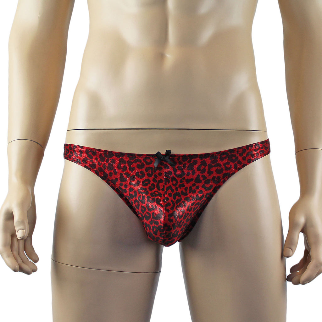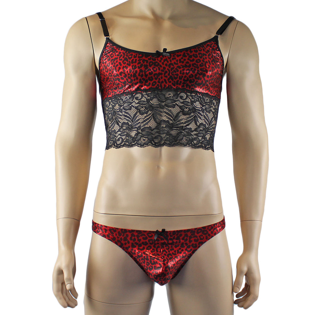 Mens dazzle animal leopard print Bra Top Camisole with wide lace bottom, has elastic adjustable shoulder straps and satin bow front, easily slips on over the head or step into it. Comes with mens pouch Thong with satin bow front, sexy and wild