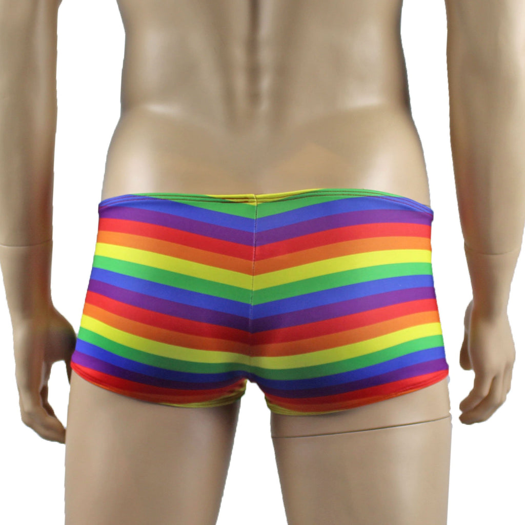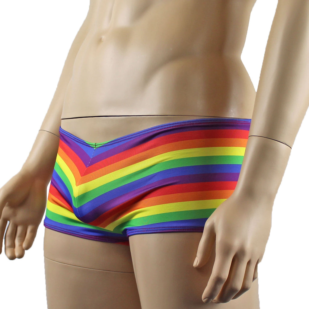 Mens stretch spandex lycra gay pride rainbow LGBTQ design low rise Boxer Shorts with slightly contoured pouch front and elasticized waist and legs