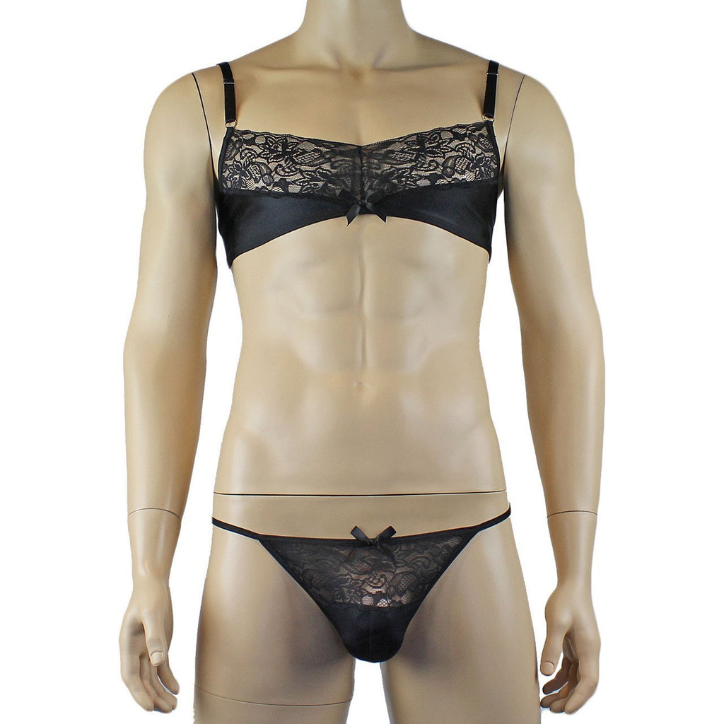 Mens Glamour Bra Top and Pouch G string with Lace Trim Black