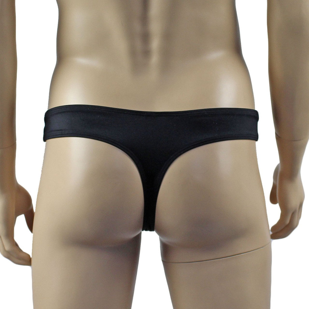 Mens stretch spandex lycra and floral lace high waist, wide front Thong Panty, has a contoured pouch front, lace inserts in the front and has a sexy wide back view, elasticized sides and waist and has a satin bow on the front. Comfortable and sexy.