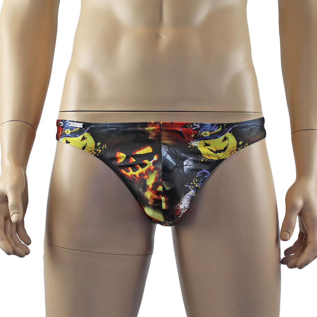 Mens Halloween full front Thong in stretch spandex lycra with halloween fire breathing pumkpins and witches print, have some fun trick or treating in this very naughty Thong