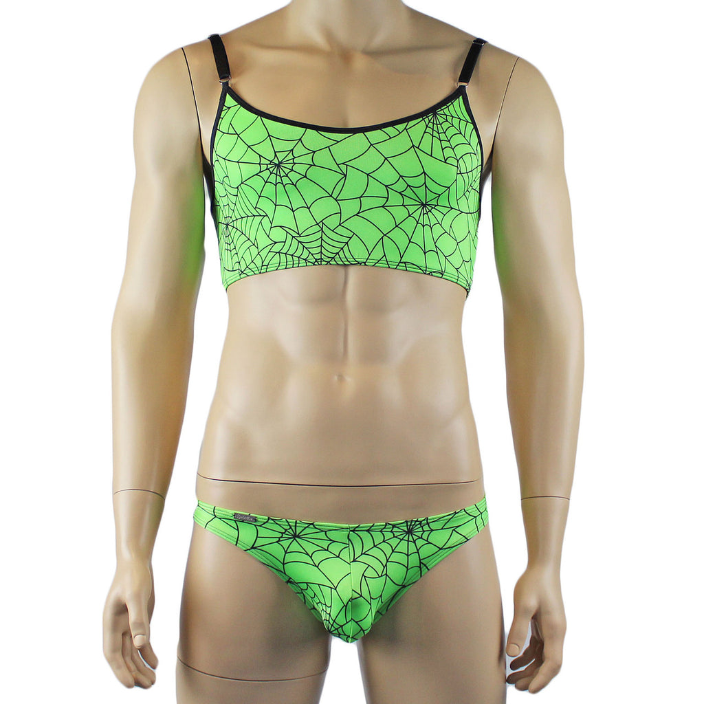 Mens stretch spandex spider web print Halloween Camisole Bra Top with adjustable shoulder straps, comes with Bikini Brief with sexy back.