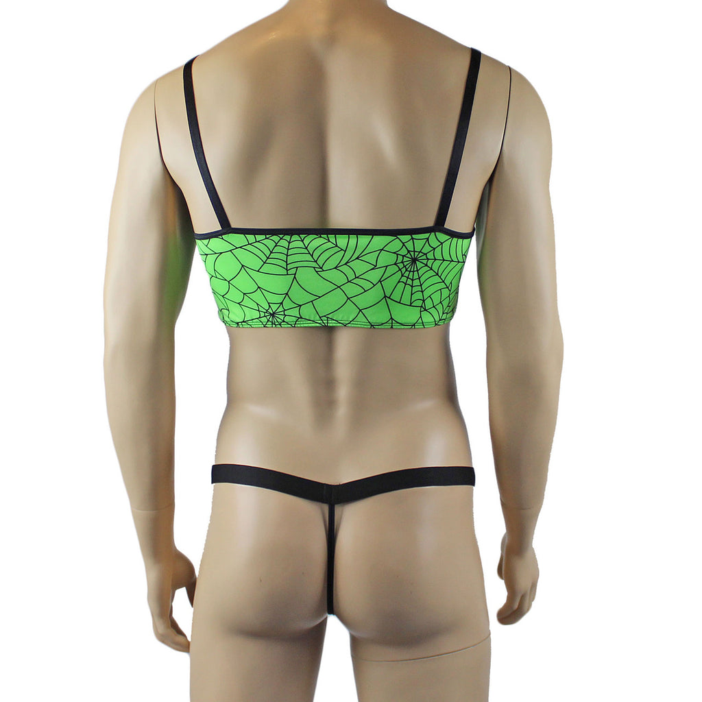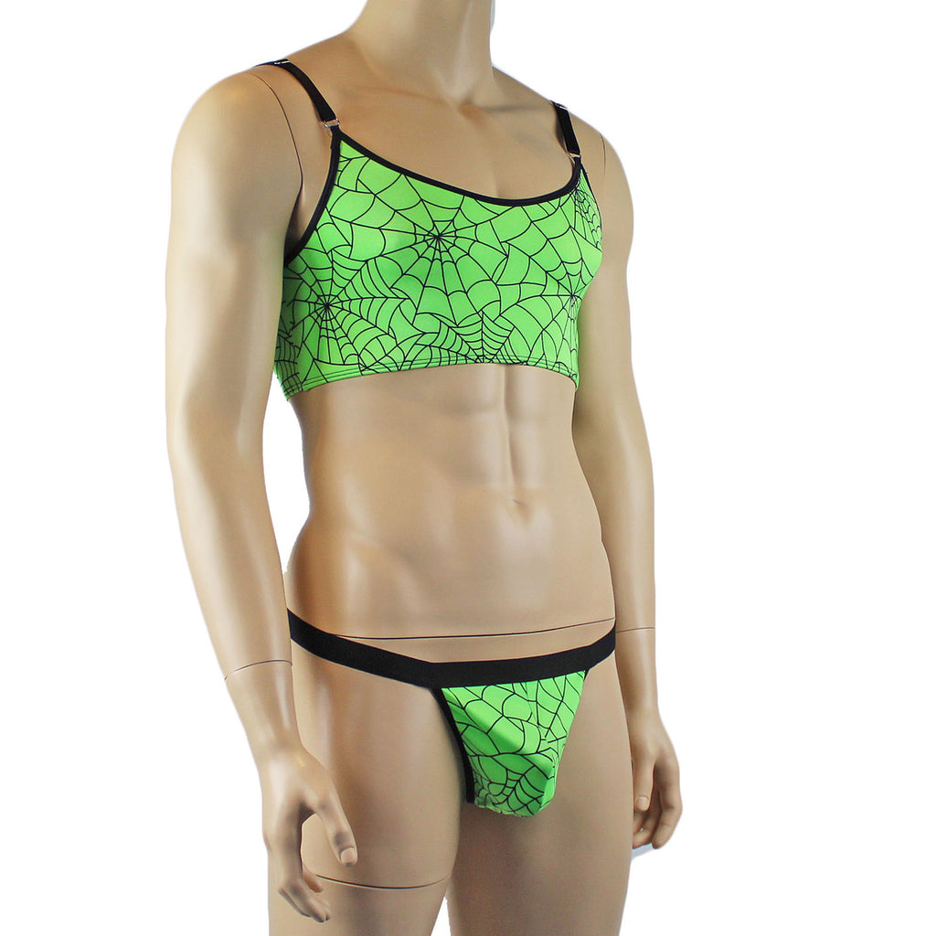 Mens stretch spandex spider web print Halloween Camisole Bra Top with adjustable shoulder straps, comes with matching G string Thong with an elastic T back and wide soft elastic waist band.