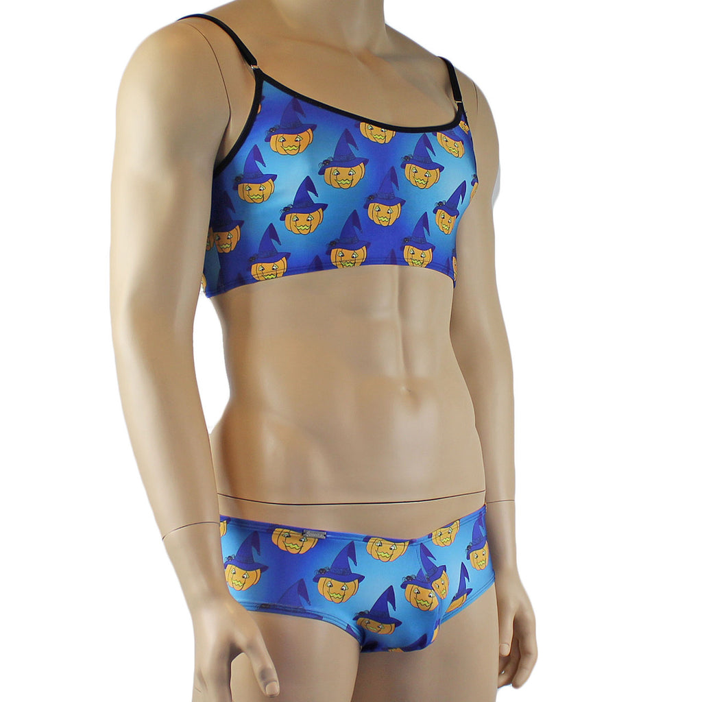 Mens Halloween Camisole Top in stretch spandex lycra with halloween witches pumpkin face print, has strong elastic shoulder straps with metal adjustments, comes with mini Boxer Briefs with contoured pouch front, makes a great halloween set