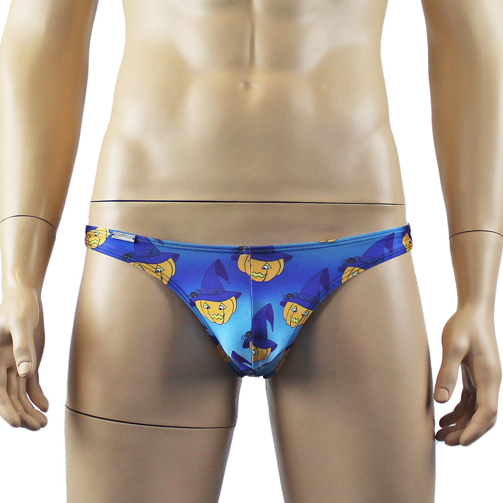 Mens Halloween mini Thong in stretch spandex lycra with halloween witches pumpkin face print, have some fun trick or treating in this very naughty Thong.