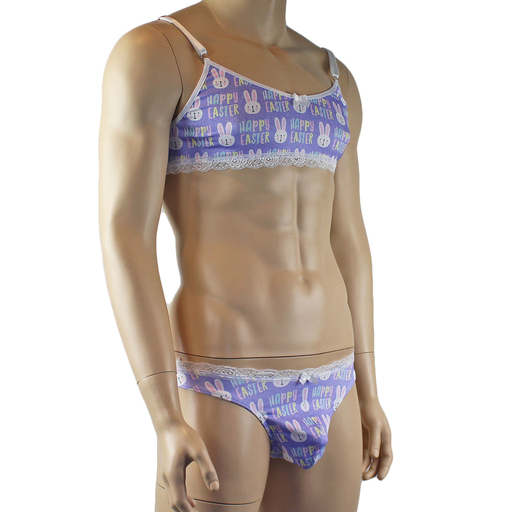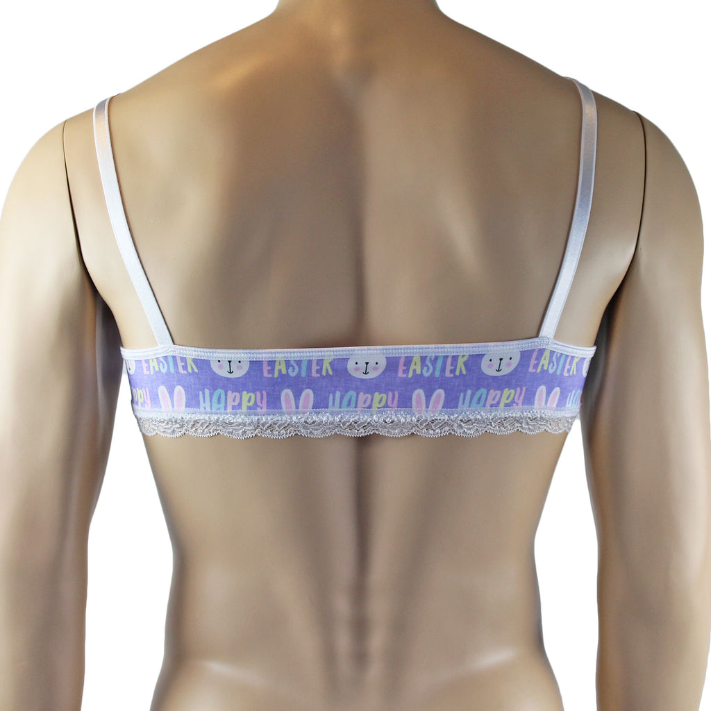 Mens stretch spandex Happy Easter print Bra Top with easy slip over the head or step into it options, has adjustable shoulder straps, lace trim and satin bow front. Comes with matching G string Thong, be sexy at Easter