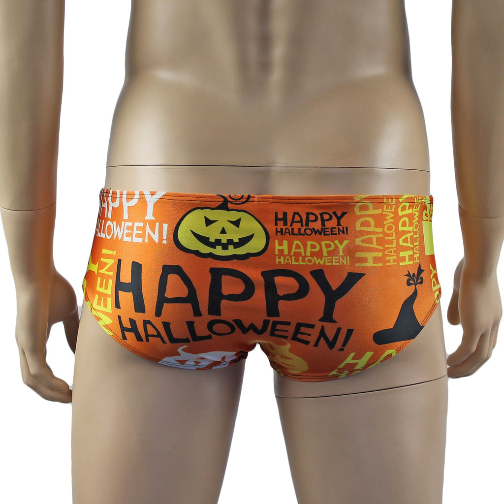 Mens Halloween mini Boxer Briefs in stretch spandex lycra with a "Happy Halloween" and pumpkins print, have some fun trick or treating in this very naughty Brief