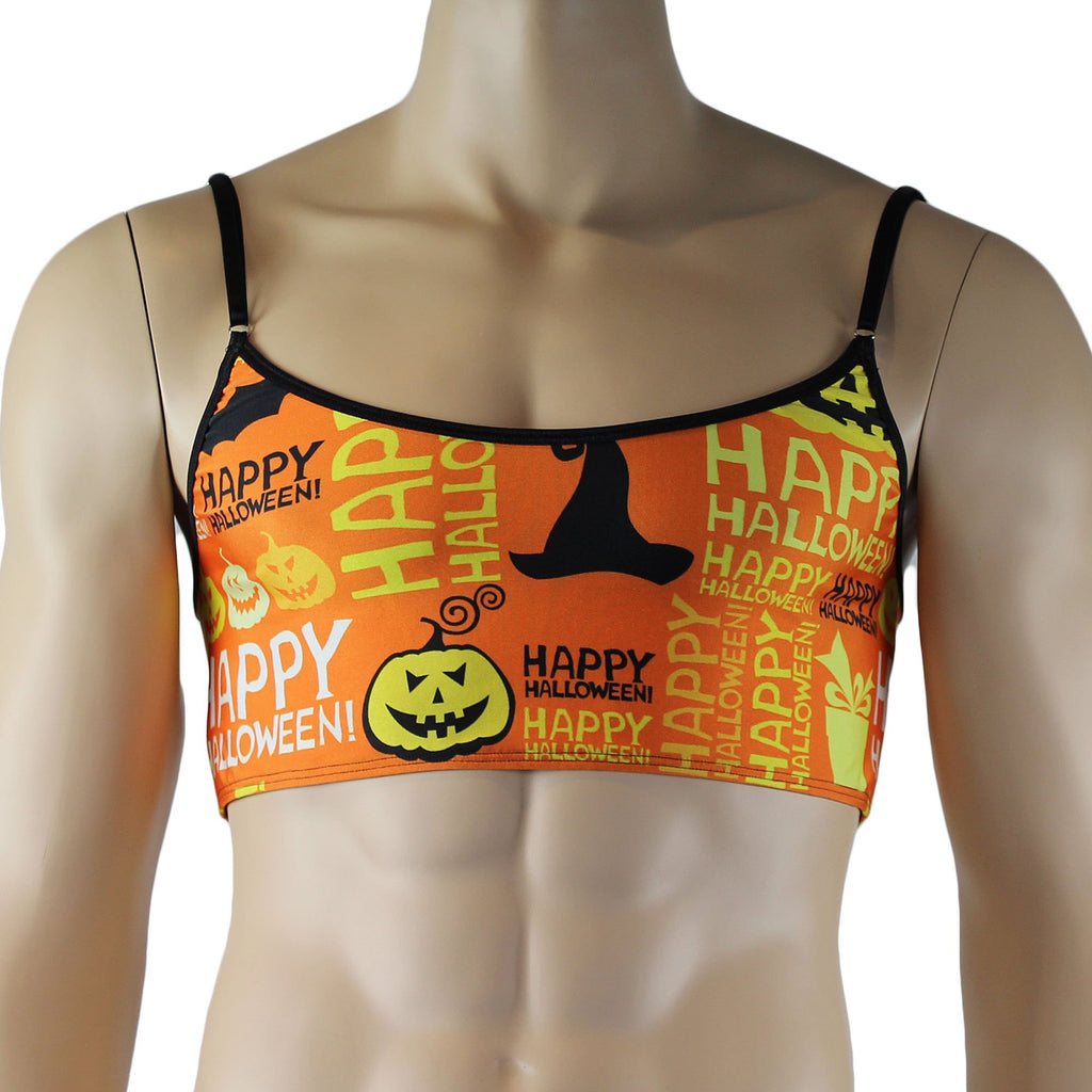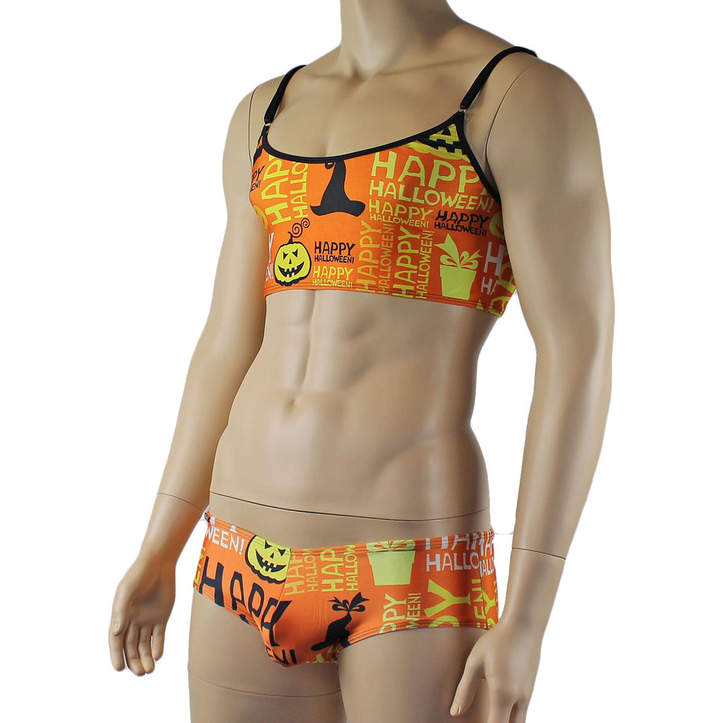 Mens Halloween Camisole Top in stretch spandex lycra with a "Happy Halloween" and pumpkins print, has strong elastic shoulder straps with metal adjustments, comes with mini Boxer Briefs with contoured pouch front, makes a great halloween set