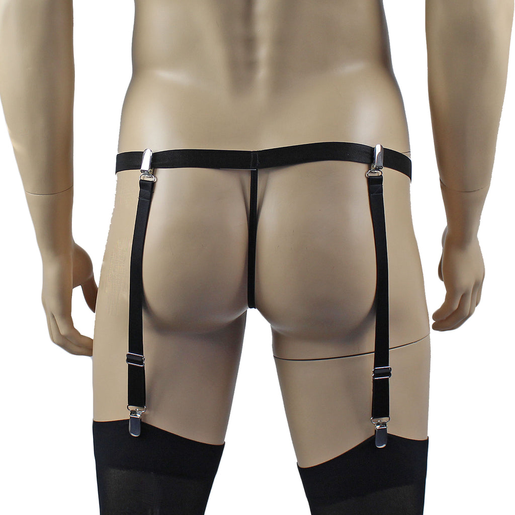 Stretch nylon lycra Thong with pouch front and has an adjustable wide elastic waistband with metal clips on the sides, comfortable and stylish. Comes with a detachable adjustable clip-on Garters to match. Mix and match, use on other garments. Includes Stockings.