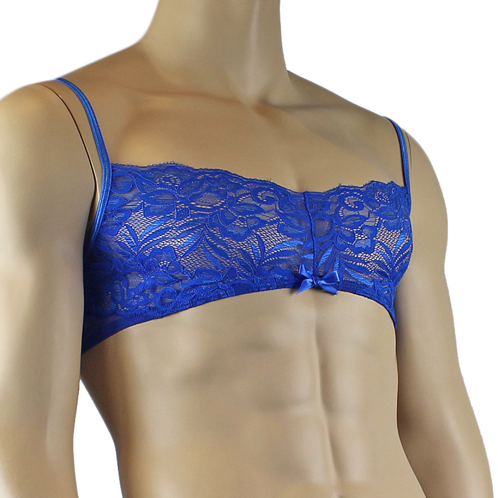 Mens stretchy sheer mesh and floral lace Bra Top with scalloped edge detail, has V front to give shape, thin elastic adjustable shoulder straps with metal rings and satin bow front, easily slips on over the head or step into it.