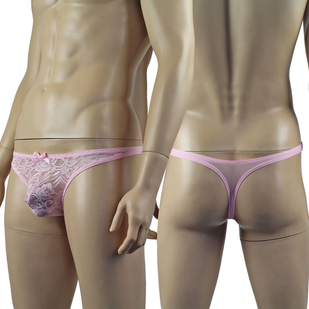 Mens Kristy Sexy Lace Thong Panties with Stretch Mesh Back Light Pink