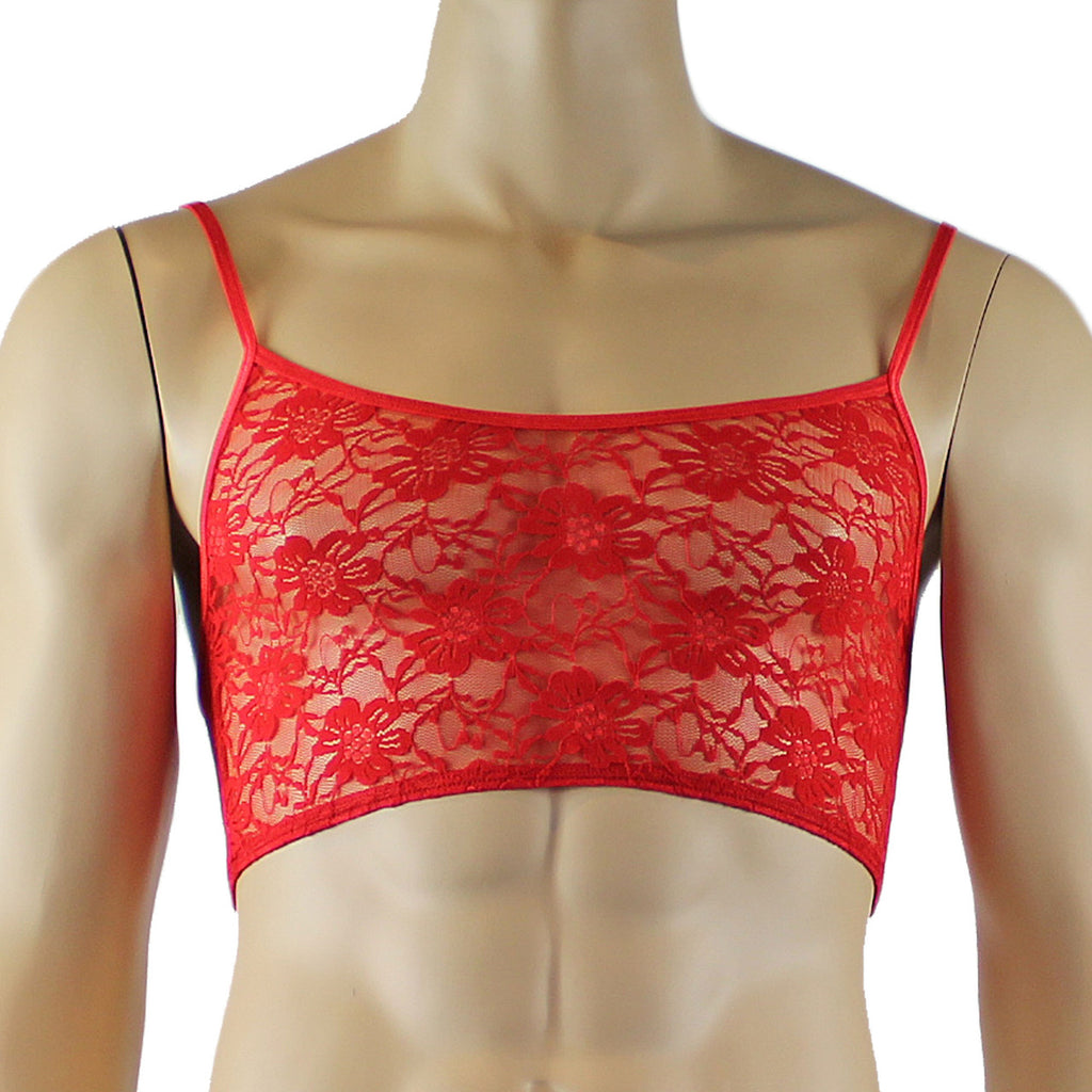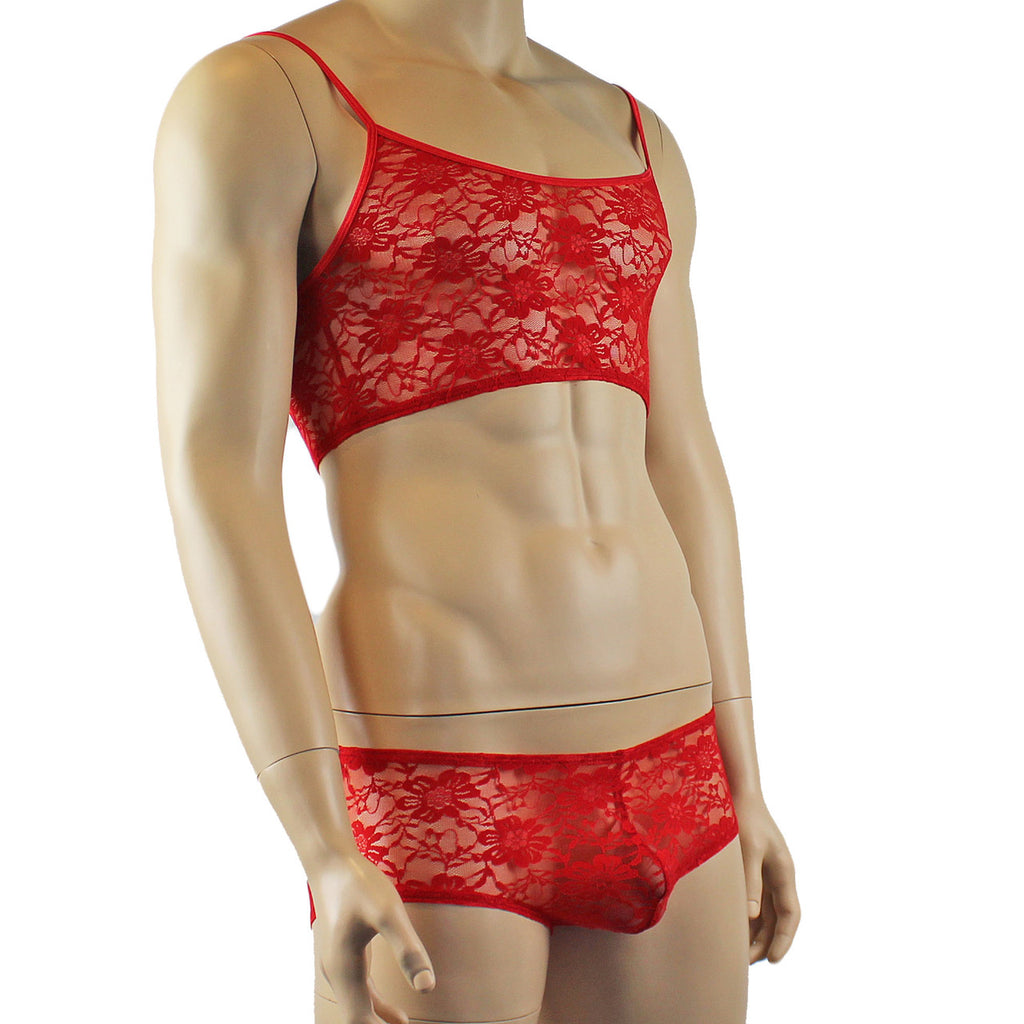 Mens Sexy Lace Crop Bra Top Camisole and Male Lingerie Panty Briefs Red