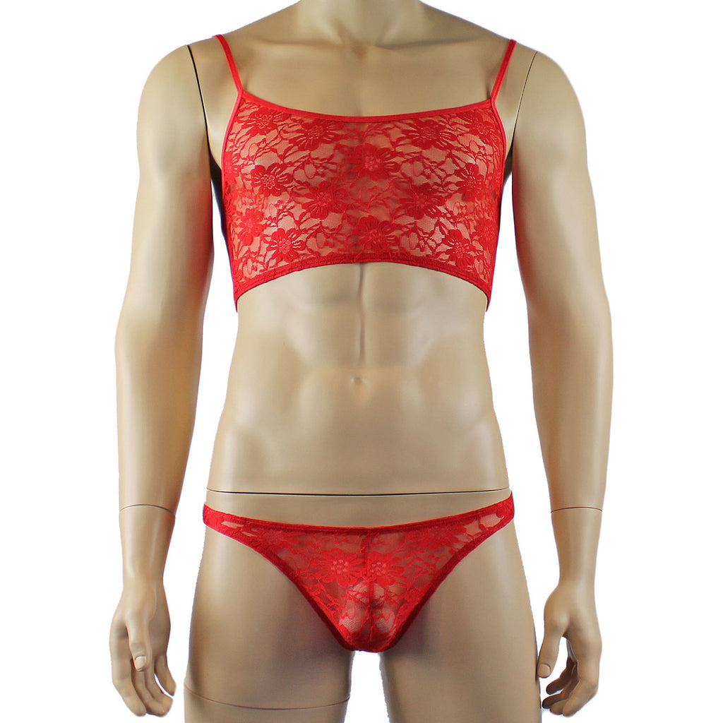 Mens sexy floral soft lace Crop Bra Top with elastic adjustable shoulder straps, comes with a matching Thong with elastic sides and top