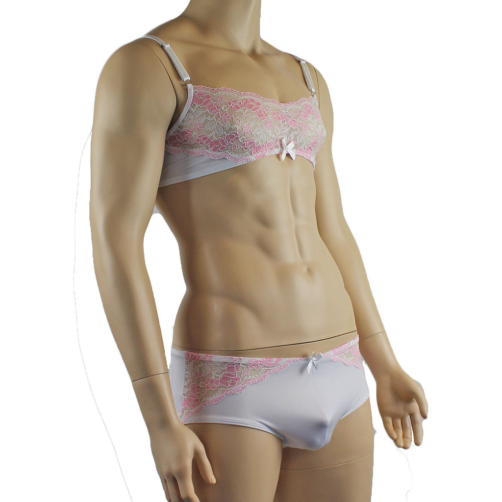 Mens stretch soft milliskin spandex Bra Top with beautiful floral lace trim, has adjustable shoulder straps with metal adjusters and a satin bow on the front. Easy to step into or put on over your head. Comes with matching Boxer Brief.