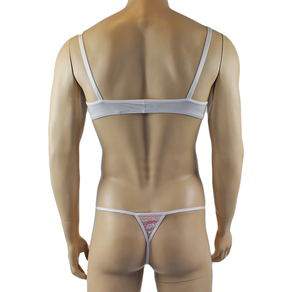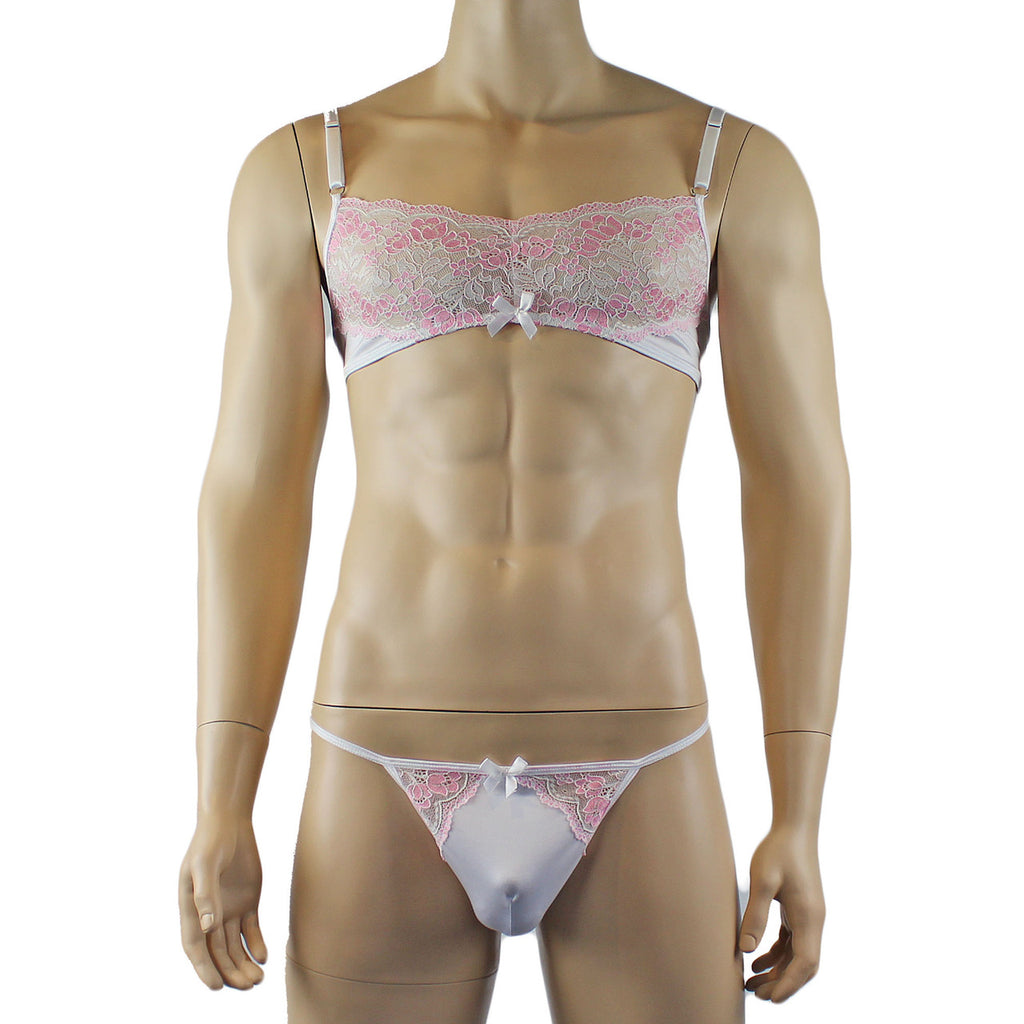 Mens stretch soft milliskin spandex Bra Top with beautiful floral ace trim, has adustable shoulder straps with metal adjusters and a satin bow on the front. Easy to step into or put on over your head. Comes with matching G string with lace on the front sides and triangle back, and has a satin bow front