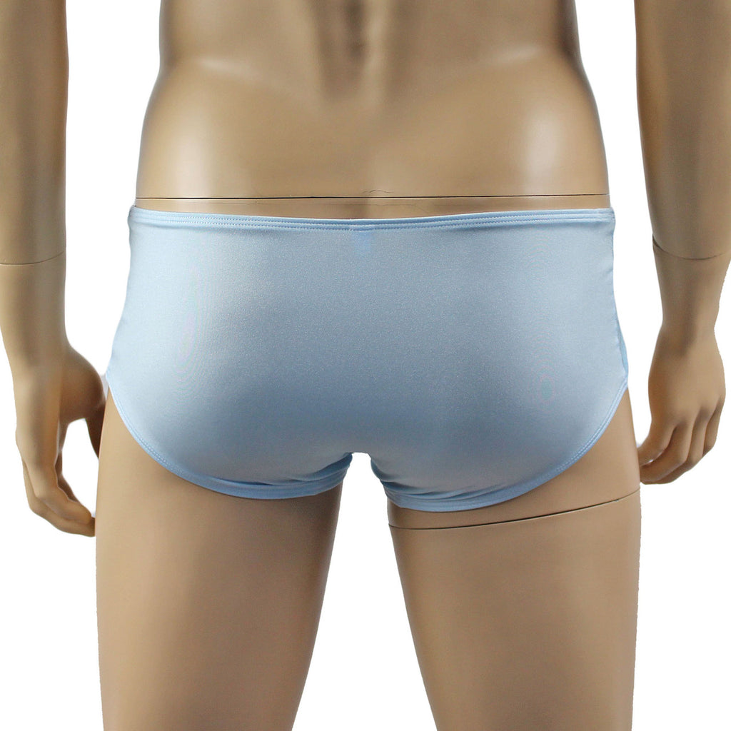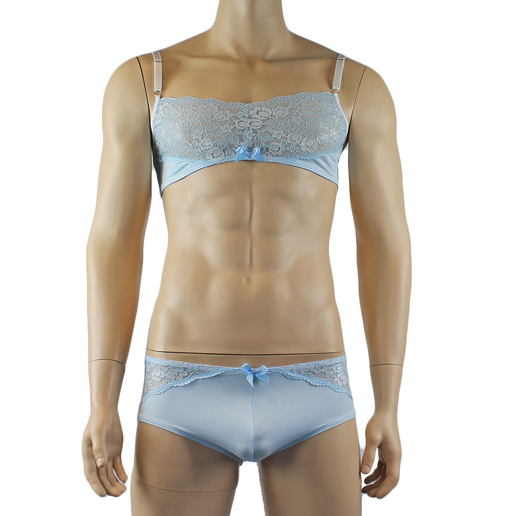 Mens stretch soft milliskin spandex Bra Top with beautiful floral lace trim, has adjustable shoulder straps with metal adjusters and a satin bow on the front. Easy to step into or put on over your head. Comes with matching Boxer Brief with lace trim and satin bow front.