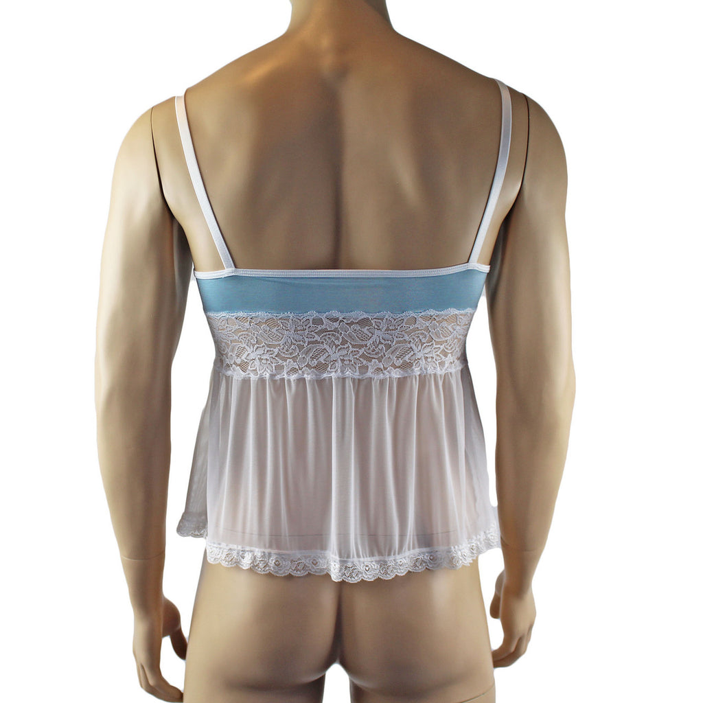 Mens Mini Babydoll or Camisole with stretch satin spandex top with attached lace and stretch mesh fabric, has adjustable shoulder straps and contrast bow accents. Easy to slip over the head or step into.