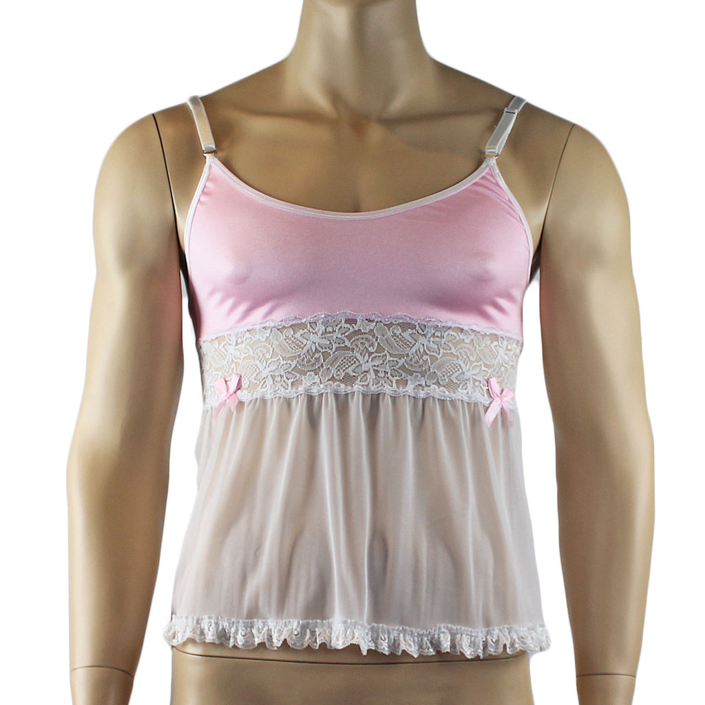 Mens Mini Babydoll or Camisole with stretch satin spandex top with attached lace and stretch mesh fabric, has adjustable shoulder straps and contrast bow accents. Easy to slip over the head or step into.