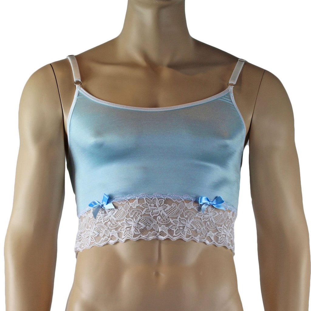 Mens stretch satin spandex lycra with floral stretch lace Crop Cami Top, has adjustable shoulder straps and bows on the front, comes with matching Thong with elastic sides and satin bow front sexy and feminine