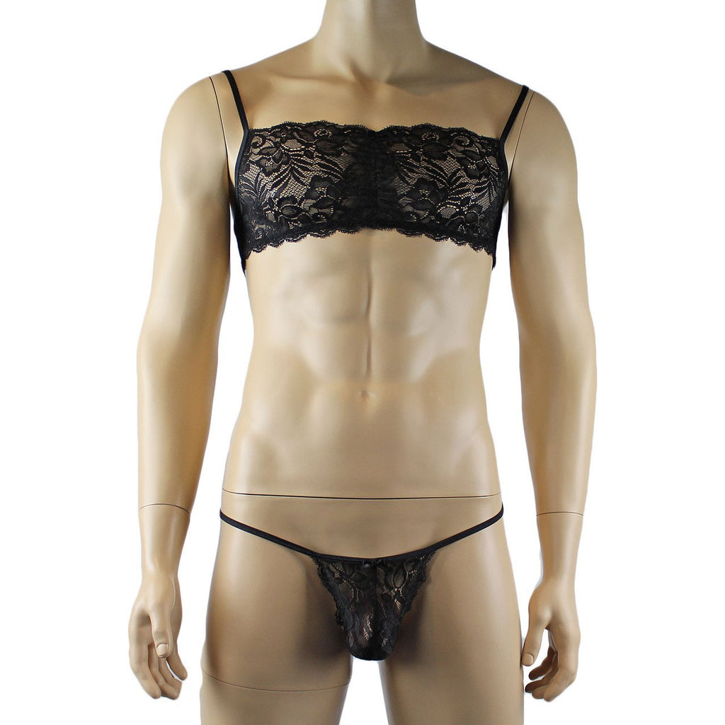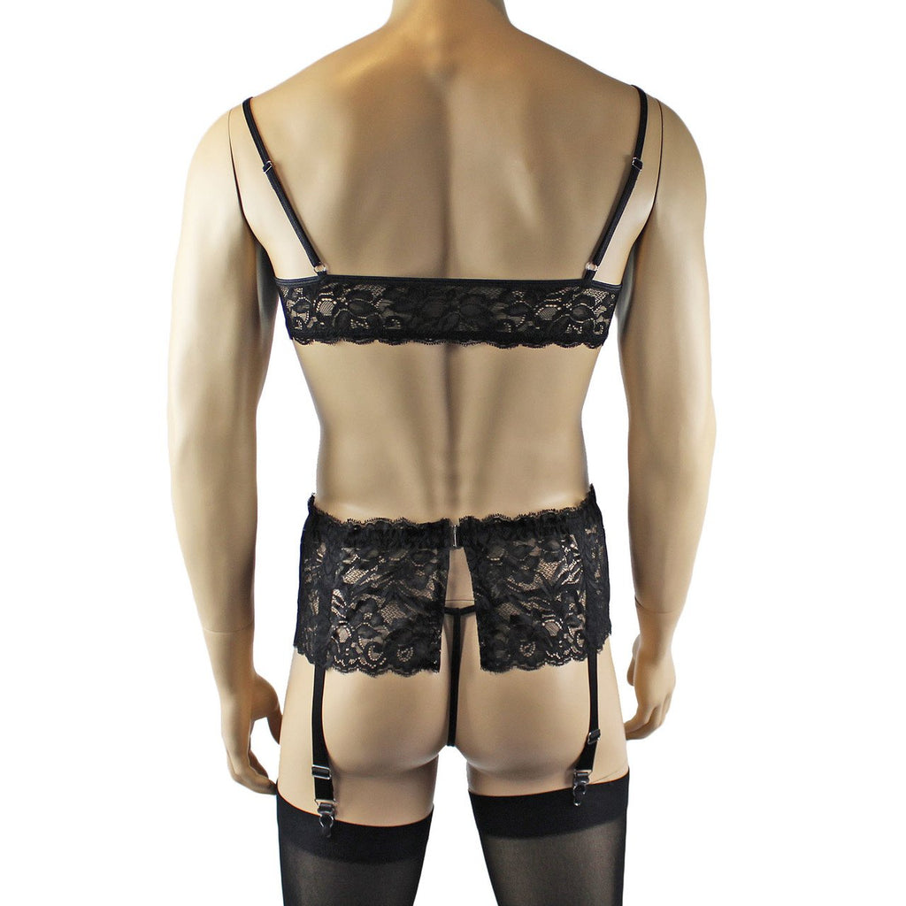 Mens floral lace Bra Top with scalloped edge detail, has gathered front to give shape, thin elastic adjustable shoulder straps with metal rings and satin bow front, easily slips on over the head or step into it. Comes with mens Pouch G string with sexy stretchy thin elastic back and waistband, has satin bow front and sexy wide lace Garterbelt with adjustable garter straps with metal clips. Includes opaque Stockings