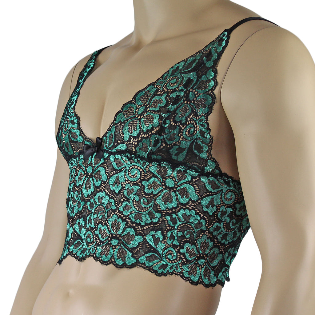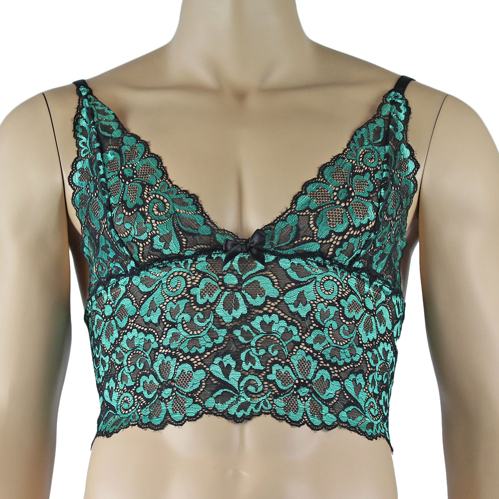Mens soft stretch shiny lace Cami Bra Top with scalloped edge triangle cups and a wide width of lace going around under the bust. Has elastic adjustable shoulder straps with metal rings and satin bow front, easily slips on over the head or step into it.