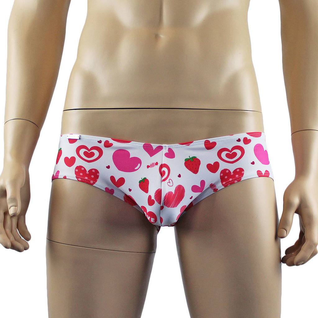 Mens stretch spandex hearts print low rise mini Boxer Briefs with contoured pouch front, has elastic around the waist and legs for strong support, sweet and feminine