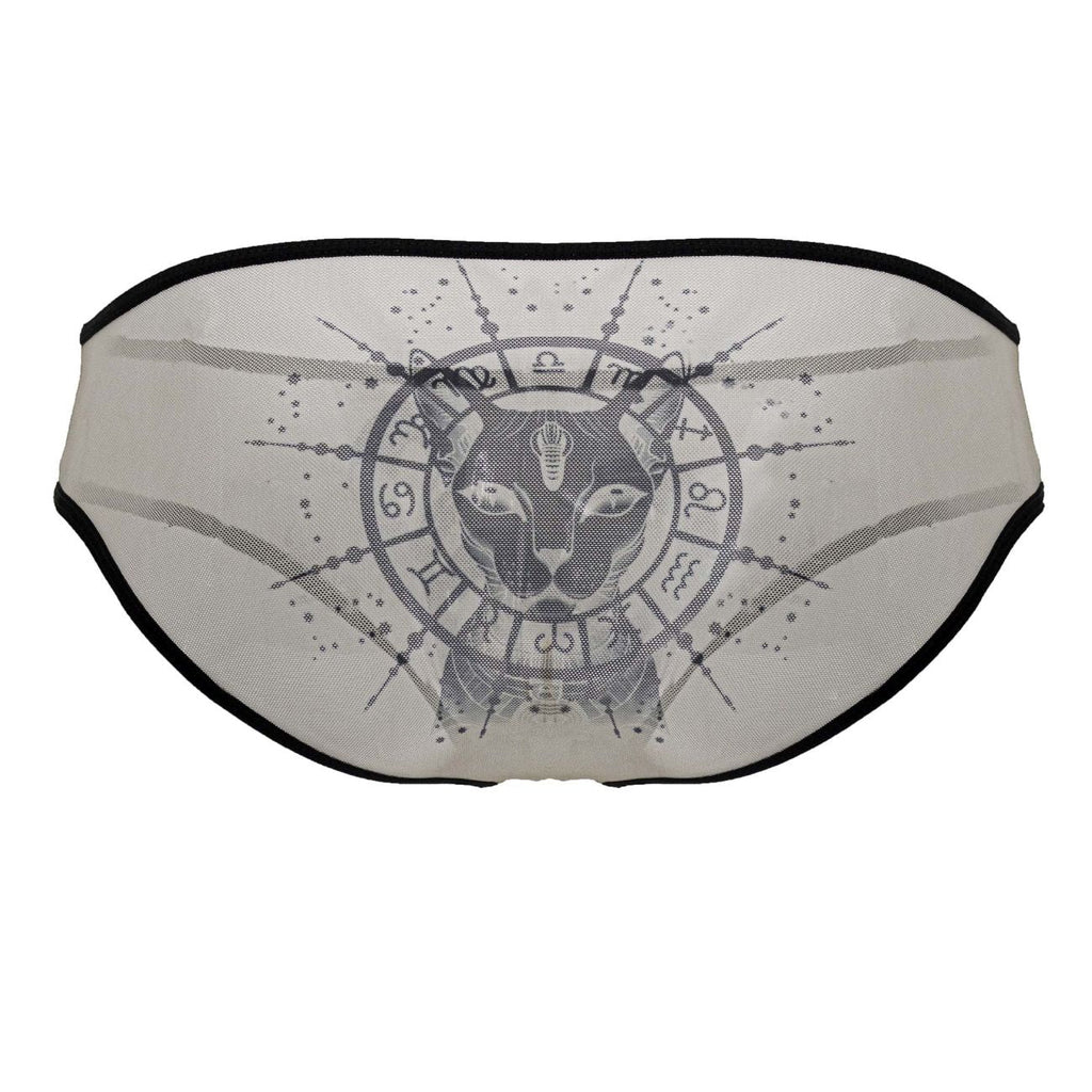 Make a fearless statement with this sheer mens bikini brief. Crafted from lightweight mesh, it showcases striking silver artwork, a coiled serpent up front and a mystical zodiac-inspired emblem on the back. The low-rise cut and smooth elastic trim deliver a sleek fit that moves with you, combining daring design with everyday comfort.