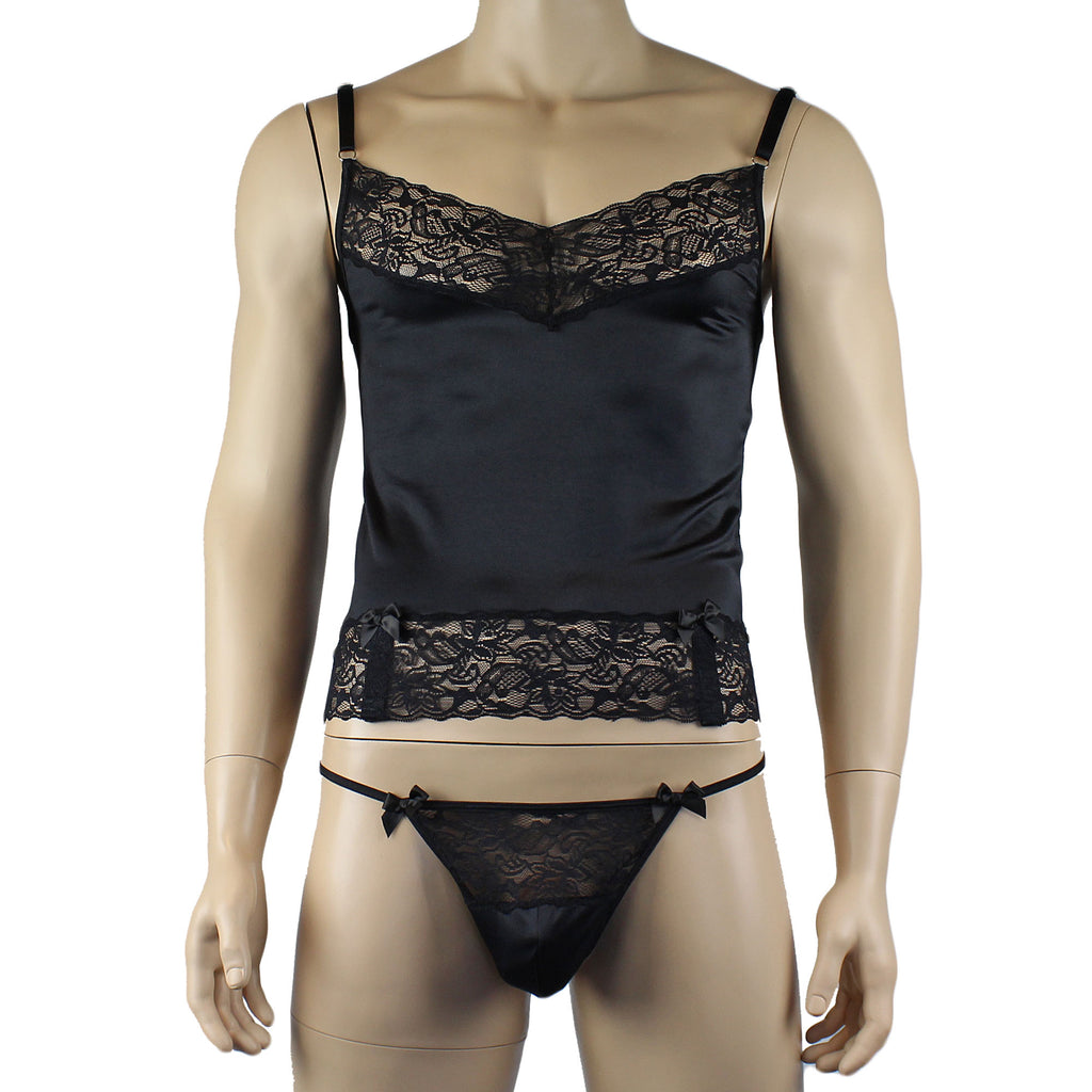 Mens romance stretch satin and floral lace Camisole Bustier Top with elastic adjustable shoulder straps and detachable adjustable strong elastic garters with metal clips and satin bows on each. Wear as a camisole or bustier with the garters. Easily step into it or pull over your head, Sexy and feminine. Comes with Pouch G string with floral lace front, sexy triangle back and double bows on the front. Includes Stockings.