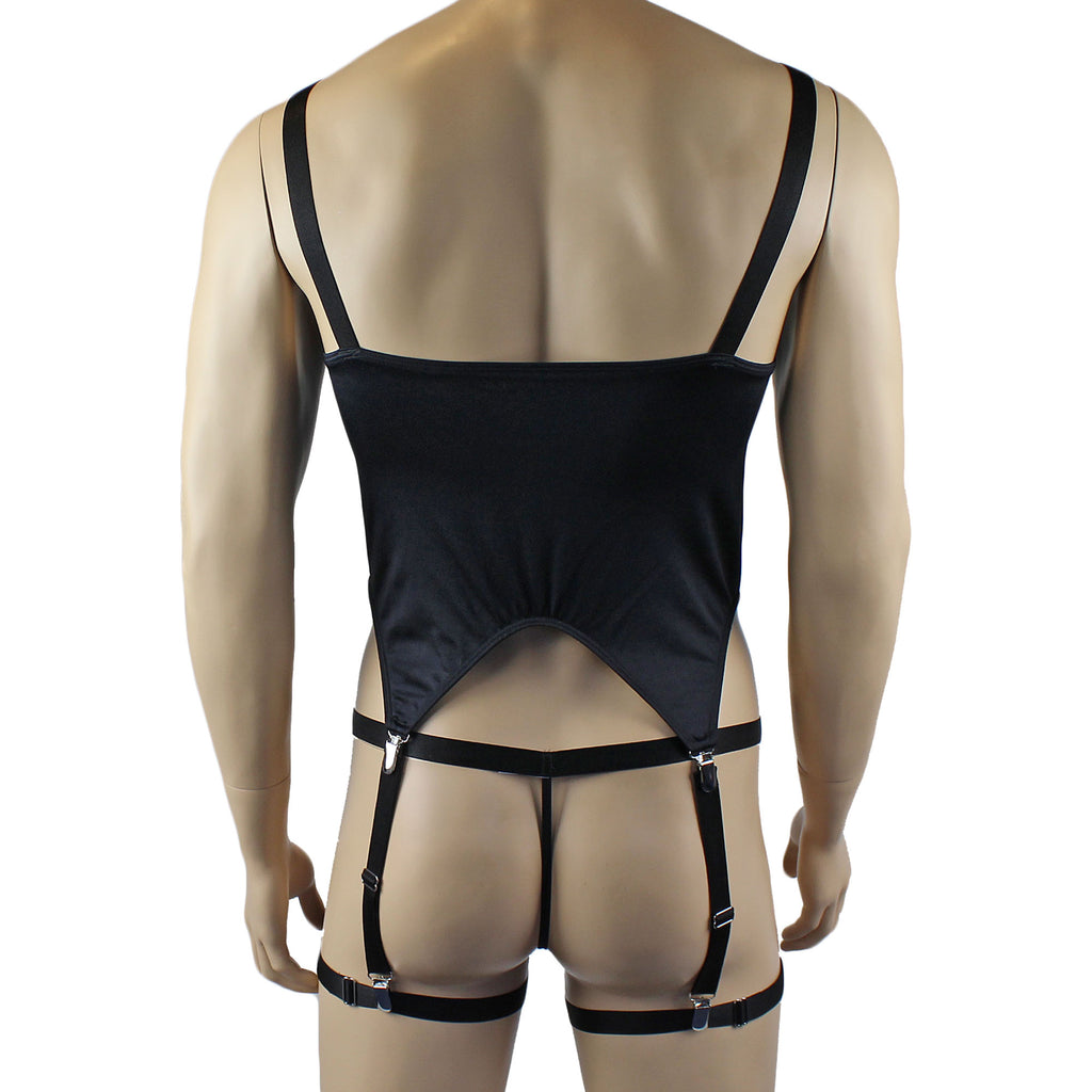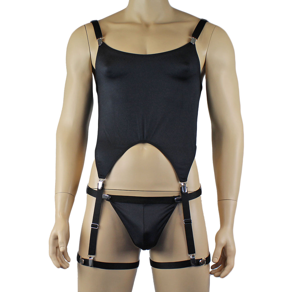 Men's stretch spandex lycra sexy Corset Top with adjustable shoulder straps with metal clip attachments, it has detachable adjustable garters with metal clips to clip onto detachable garters OR thong or another garment, mix and match with your own clothes, comes with matching G string with adjustable clip waistband and Leg Band Garters