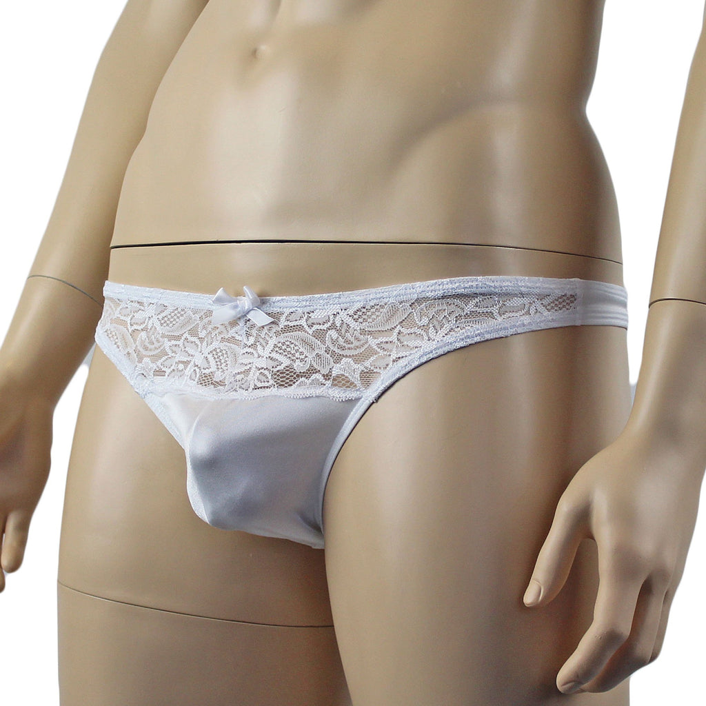 Mens stretch satin spandex and floral stretch lace low rise G string Thong with pouch front and elastic waist and legs, a sexy clip on/off Veil with satin bow and pearl bead is attached to the back. Gives a very sexy and feminine look