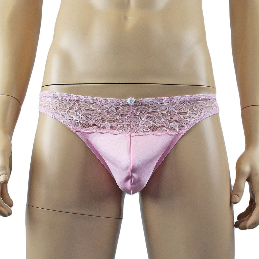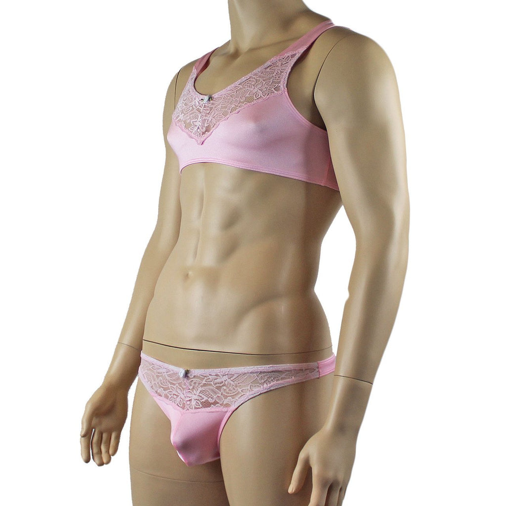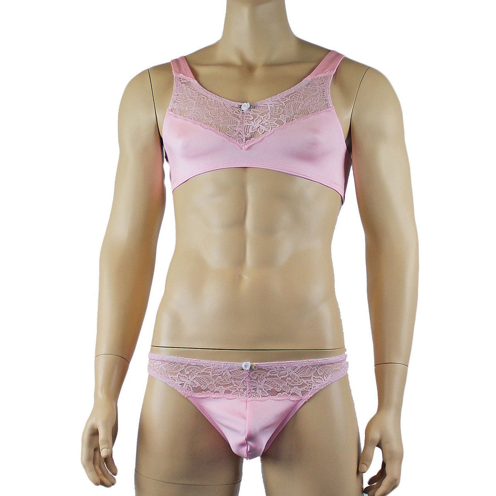 Male stretch lycra spandex Bra Top with stretch floral lace V front and rose bow detail, comes with matching G string Thong with sexy narrow cut butt and rose bow front detail, very comfortable.