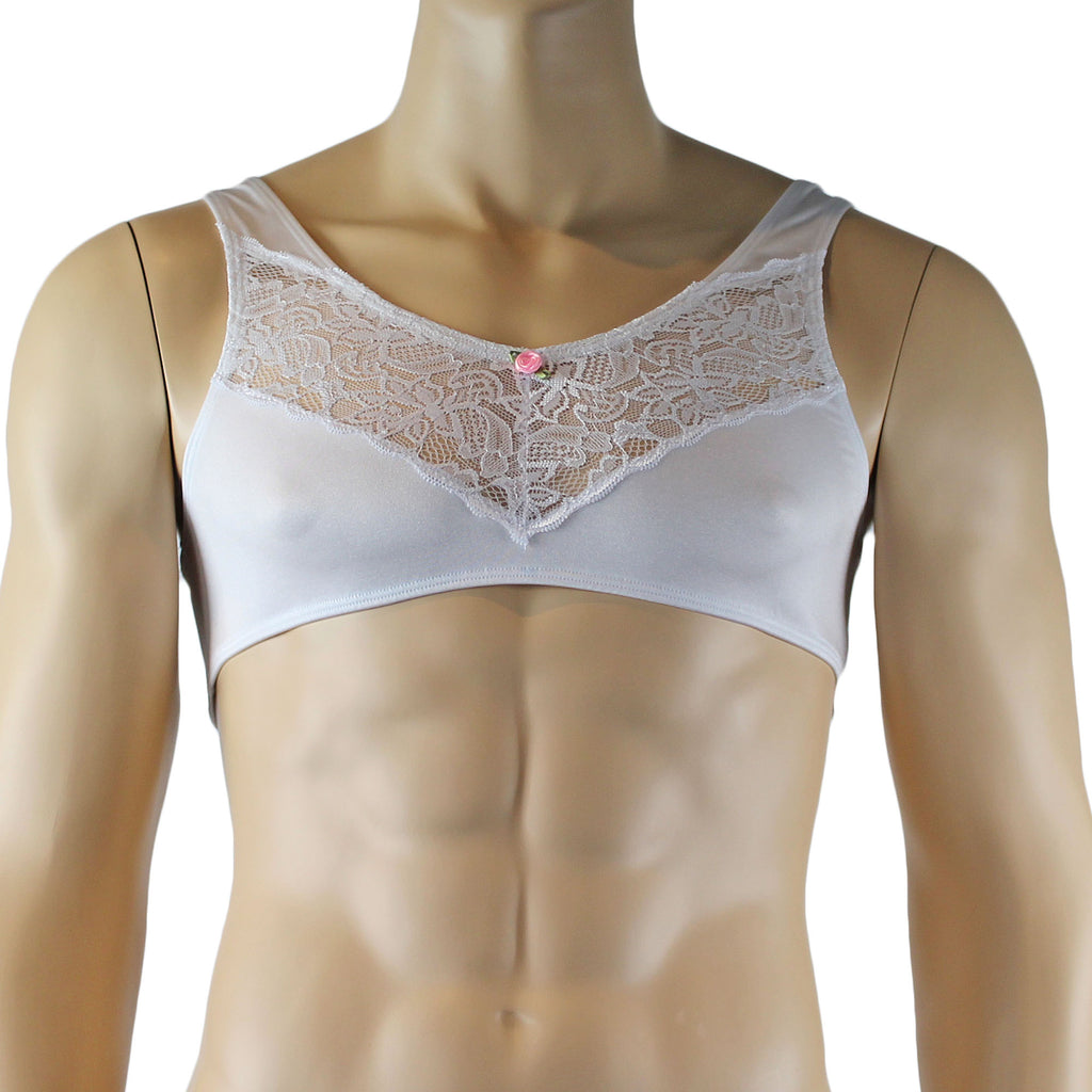 Male stretch lycra spandex Bra Top with stretch floral lace V front and rose bow detail, comes with Male Capri Bikini Brief with sexy narrow cut butt and rose bow front detail, very comfortable.