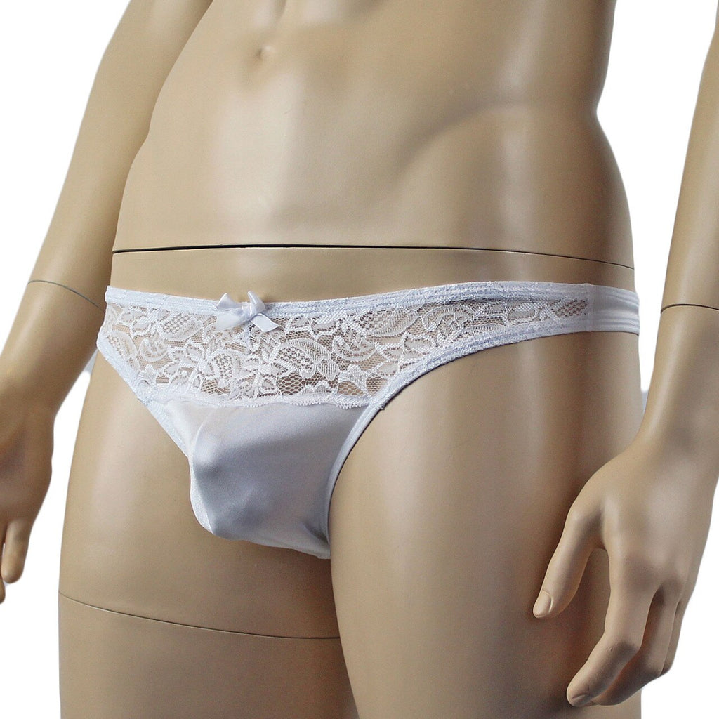Mens romance stretch satin spandex low waist Bikini Brief with floral lace front and a sexy back to cover your butt, has a satin bow front.