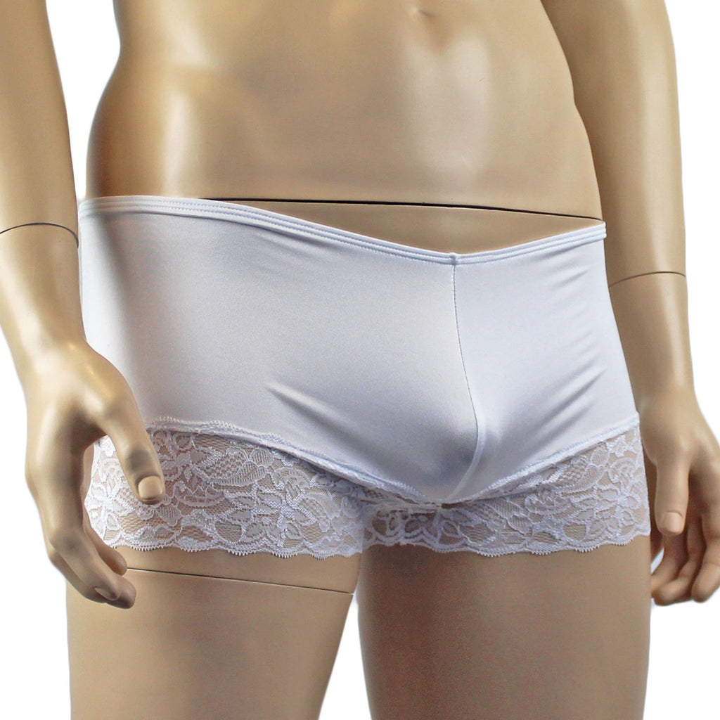 Mens romance stretch satin spandex low waist Boxer Shorts with floral lace around the legs, wide sides for comfort and has a satin bow sides.