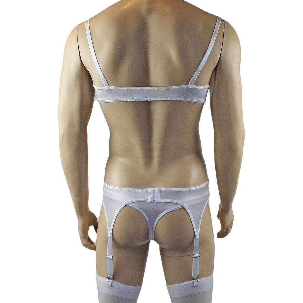 Mens romance stretch satin spandex Bra Top with floral lace front, has sexy contoured front to fit the man but not busty and adjustable shoulder straps. Easily step into it or pull over your head, Sexy and feminine. Comes with low waist G string Thong with floral lace front and a sexy back to show off your butt, has a satin bow front and Garterbelt with lace front, adjustable garters, bows on the front straps and adjustable clip back for size. Includes Stockings.