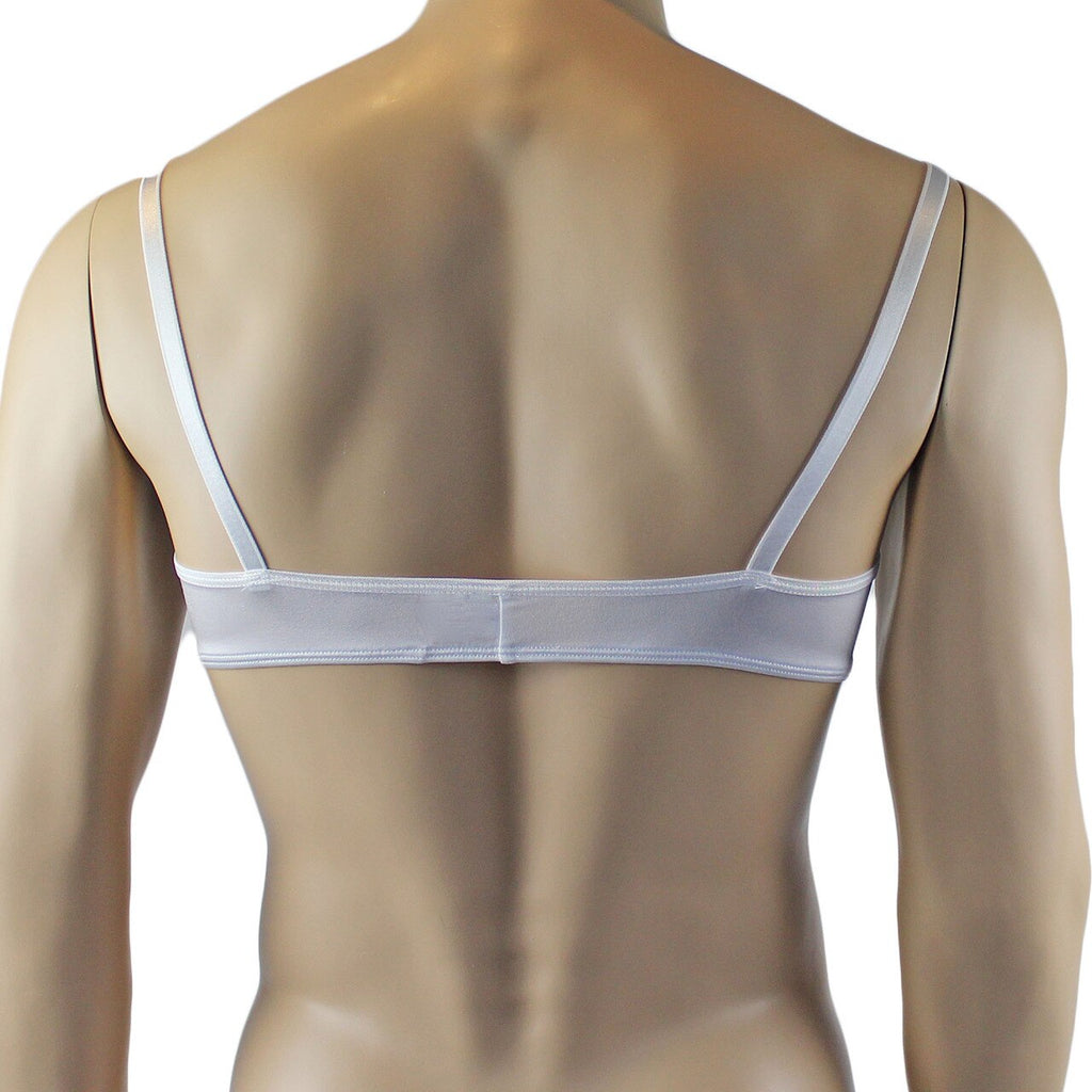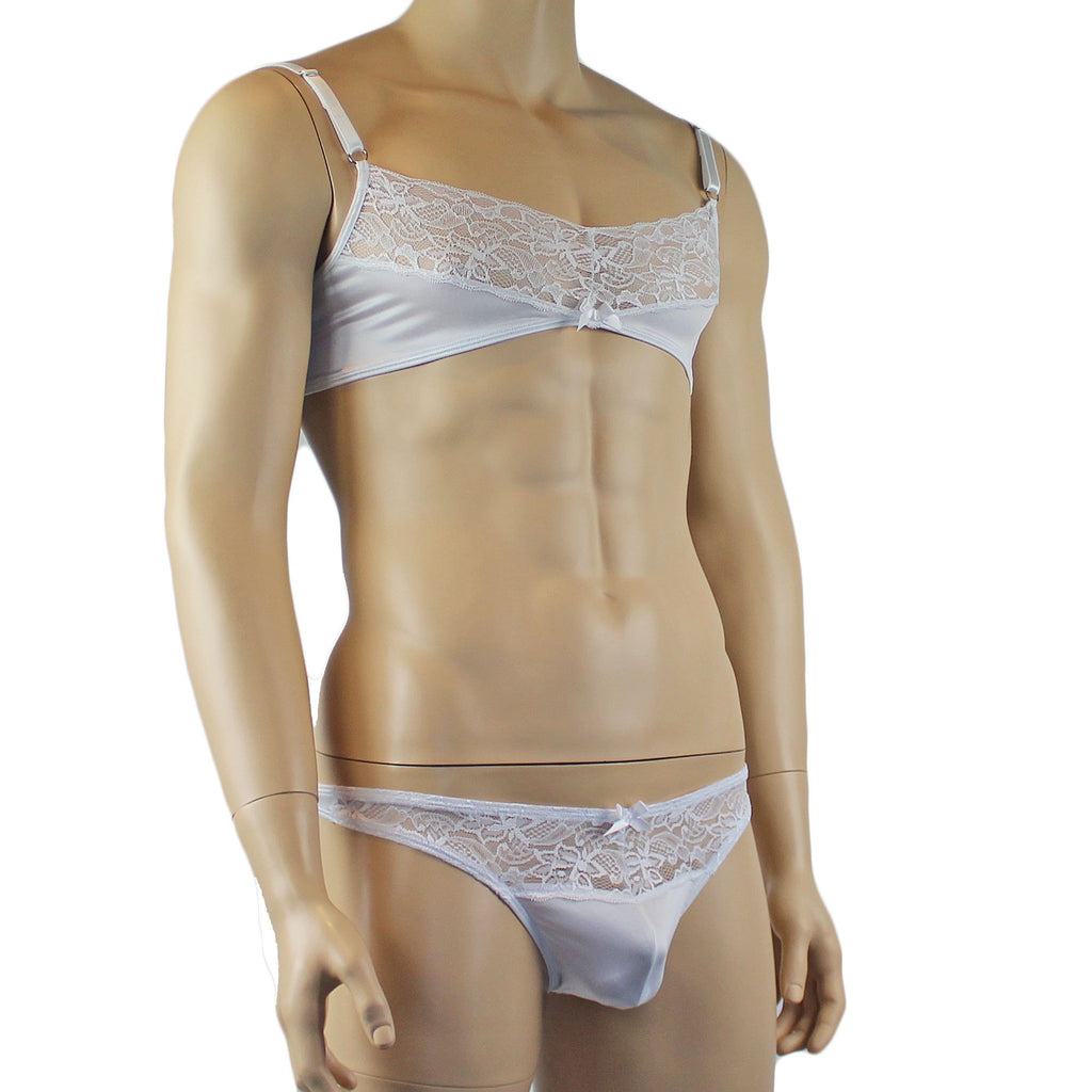 Mens romance stretch satin spandex Bra Top with floral lace front, has sexy contoured front to fit the man but not busty and adjustable shoulder straps. Easily step into it or pull over your head, Sexy and feminine. Comes with low waist G string Thong with floral lace front and a sexy back to show off your butt, has a satin bow front.