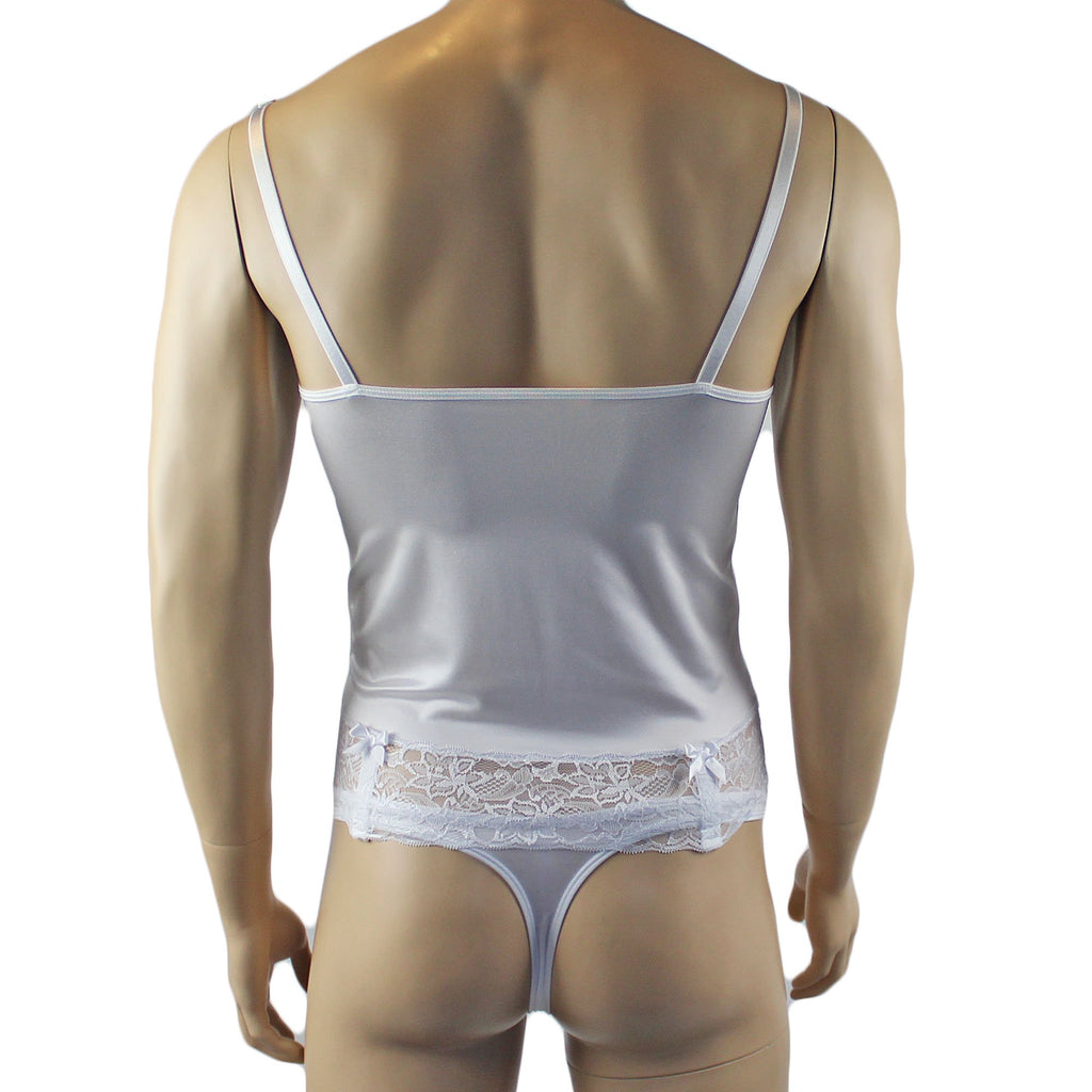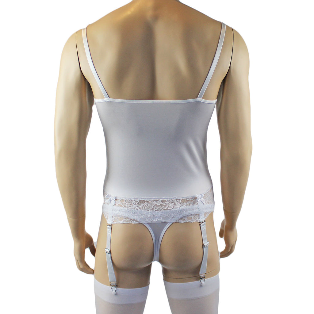 Mens romance stretch satin and floral lace Camisole Bustier Top with elastic adjustable shoulder straps and detachable adjustable strong elastic garters with metal clips and satin bows on each. Wear as a camisole or bustier with the garters. Easily step into it or pull over your head, Sexy and feminine. Comes with low waist G string Thong with floral lace front and a sexy back to show off your butt, has a satin bow front. Includes Stockings.